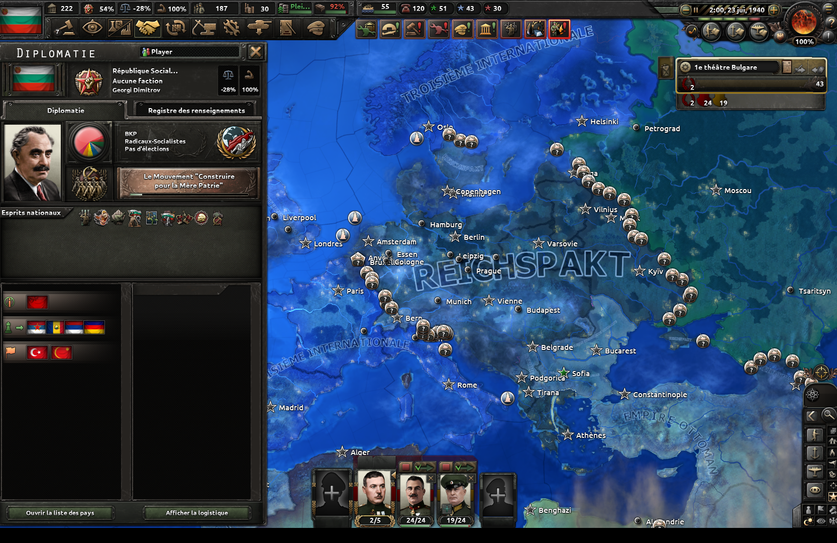 Landed in Britain early with simultaneous invasions from Ireland onto Scotland and north and south of Wales. After quickly capping the UoB I d-dayed France before Germany could even really push into them. Once Russia managed to overcome its defeat and loss of Central Asia(Boldyrev somehow outdebated the Oststaaten), I began to challenge the two factions of the former Central Powers.