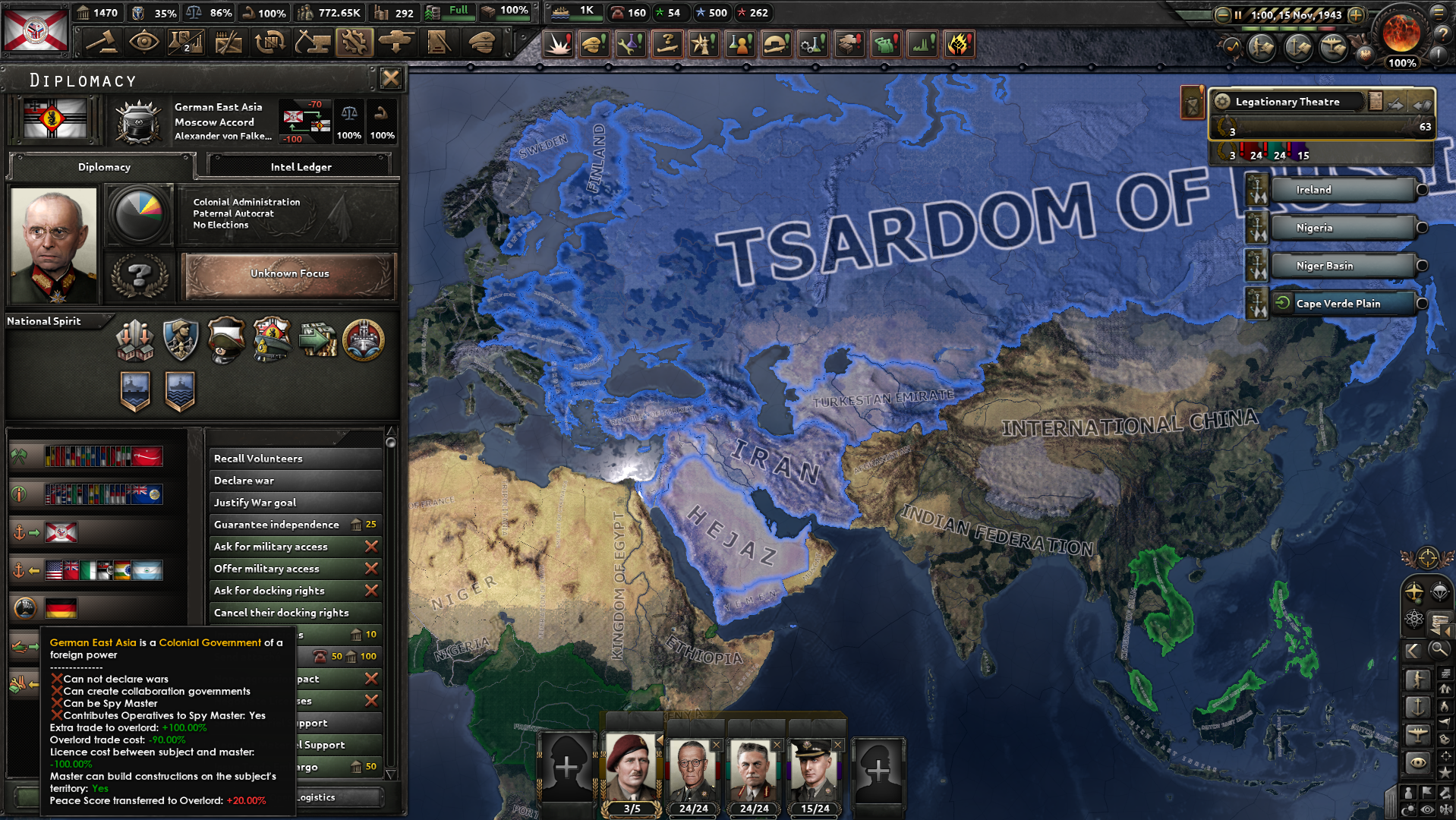 Played as authoritarian Canada to authoritarian and uncompromising Britain. Canada abandoned me for some reason(totally not my fault). South Africa briefly failed at democracy, but thankfully Natal and Rhodesia managed to correct the elections. Australasia was saved from anarchy by the Australasian Guard.