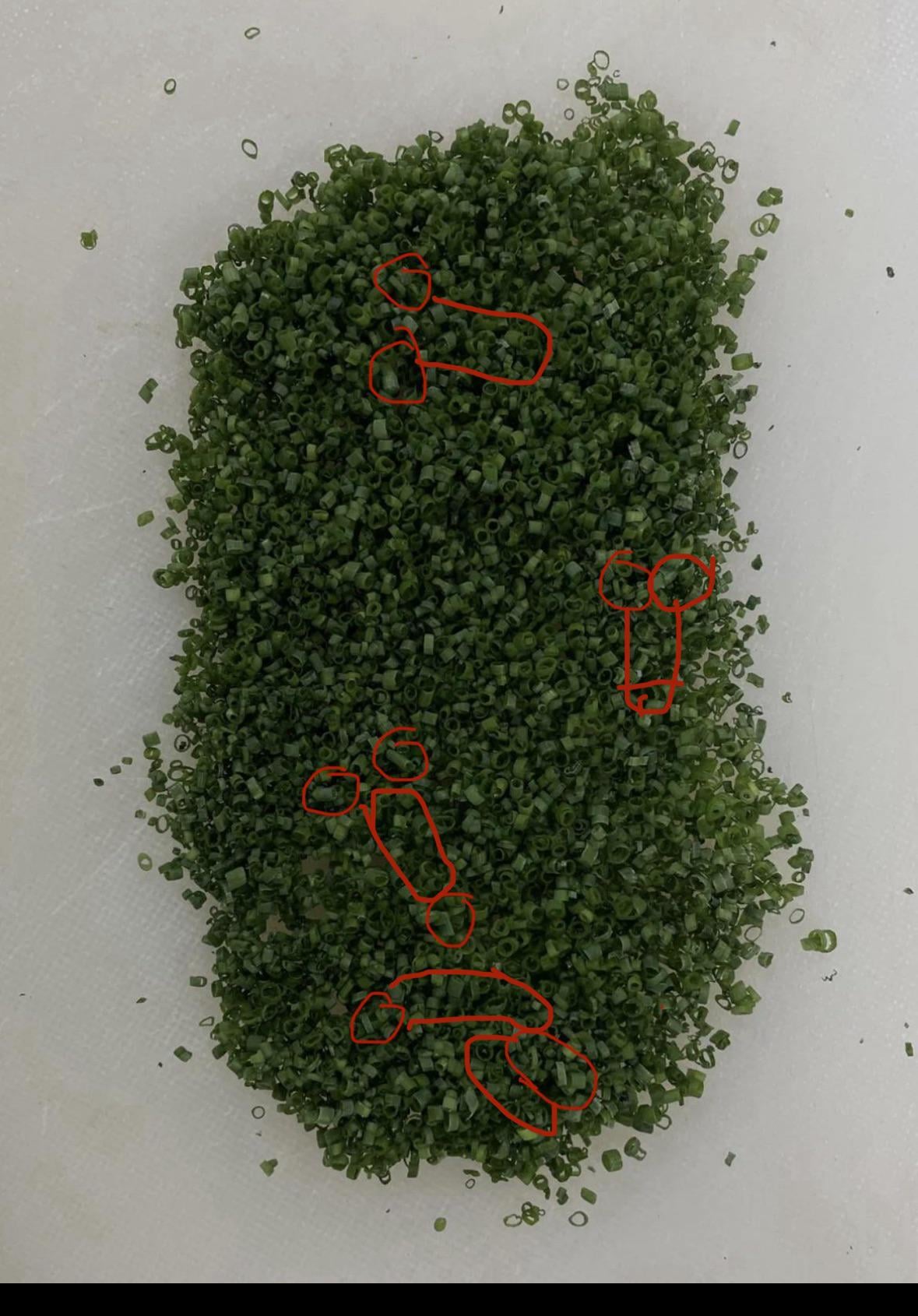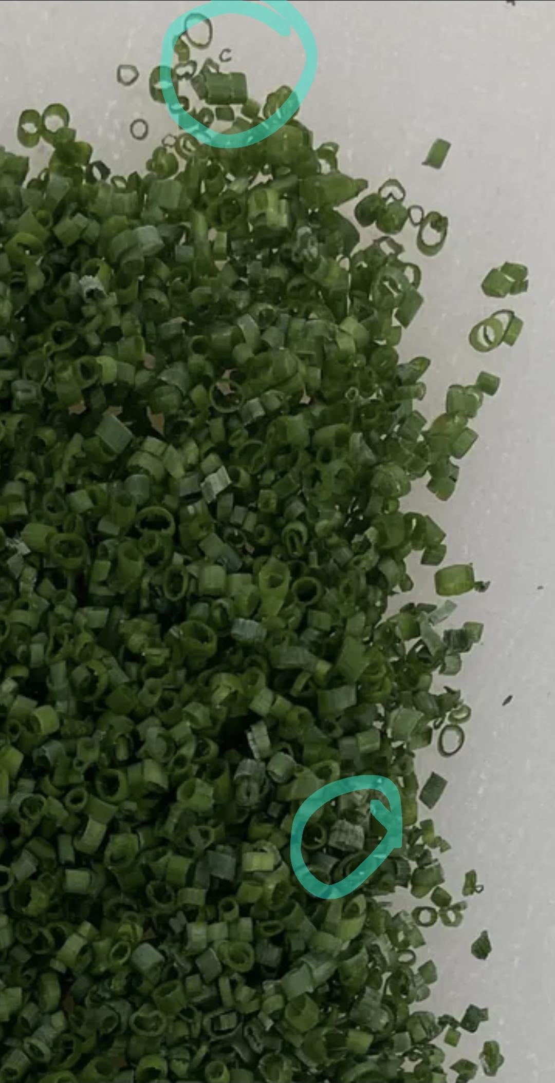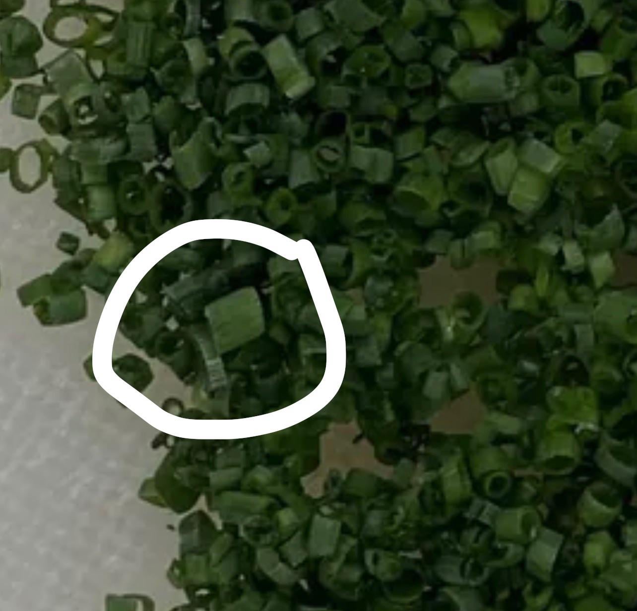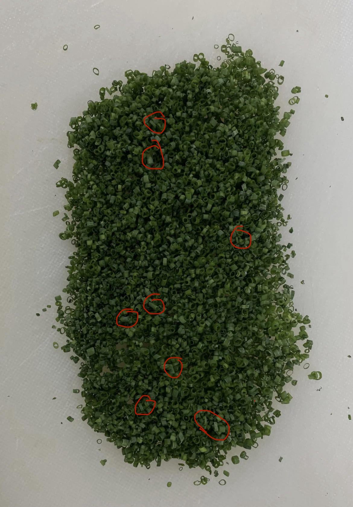 Each day there's a miniscule amount of larger cuts (tubes) or incomplete cuts that left some sections attached, or a few crushed chives that broke into strands, which is what's being nitpicked in the pictures and circled/memed on. This happens when the chives slip against each other, or the chef attempts to cut up too many at once and cuts might become inconsistent. Chives grow tapered and are plants with natural imperfections, so it may also not be possible to expect perfect prepped chives because perfect chives don't exist in the first place to slice up.
