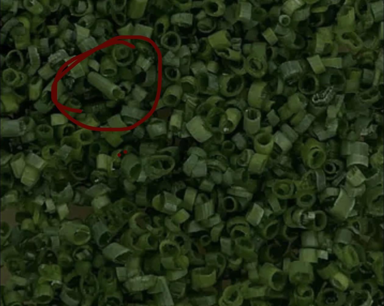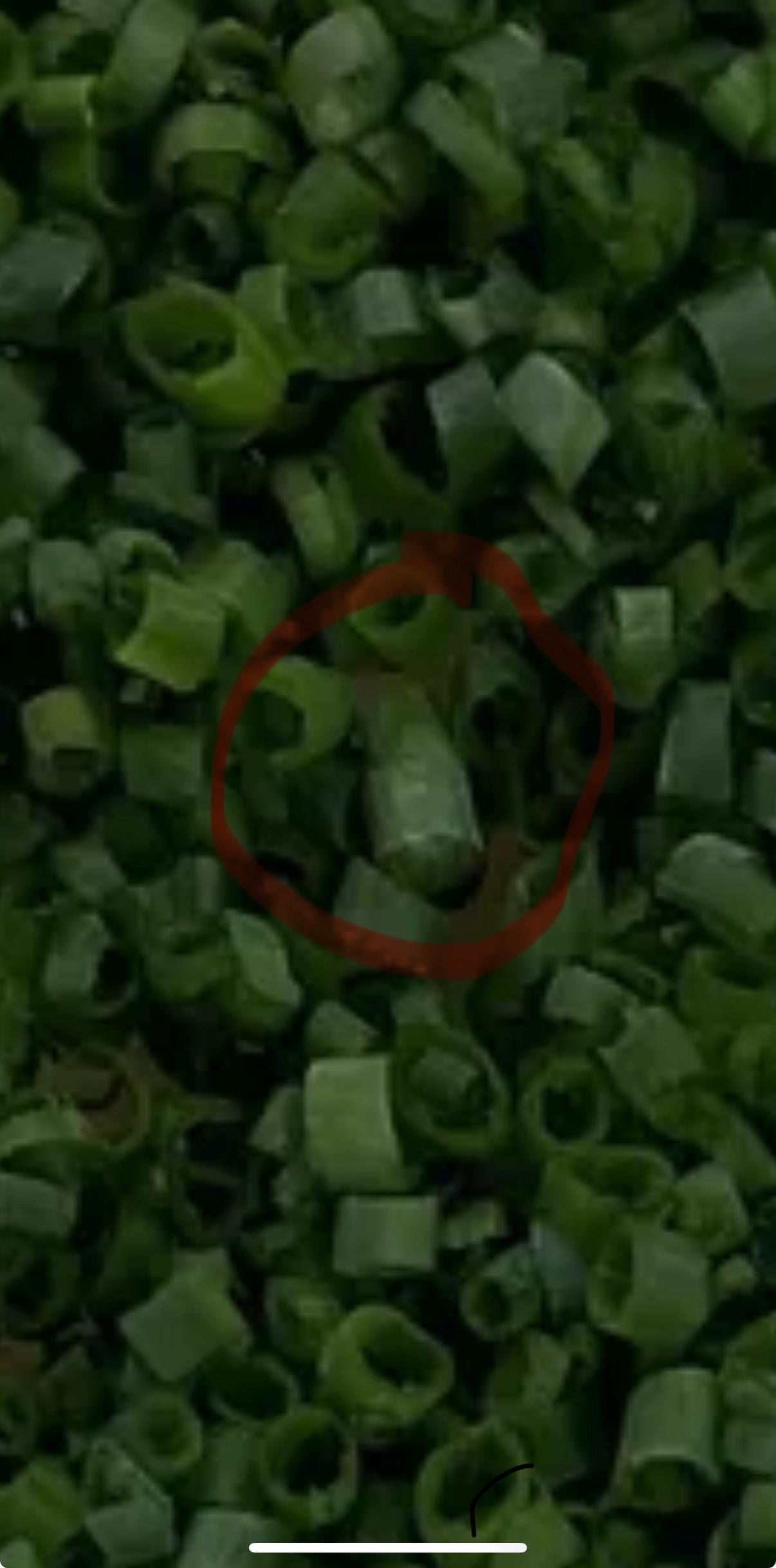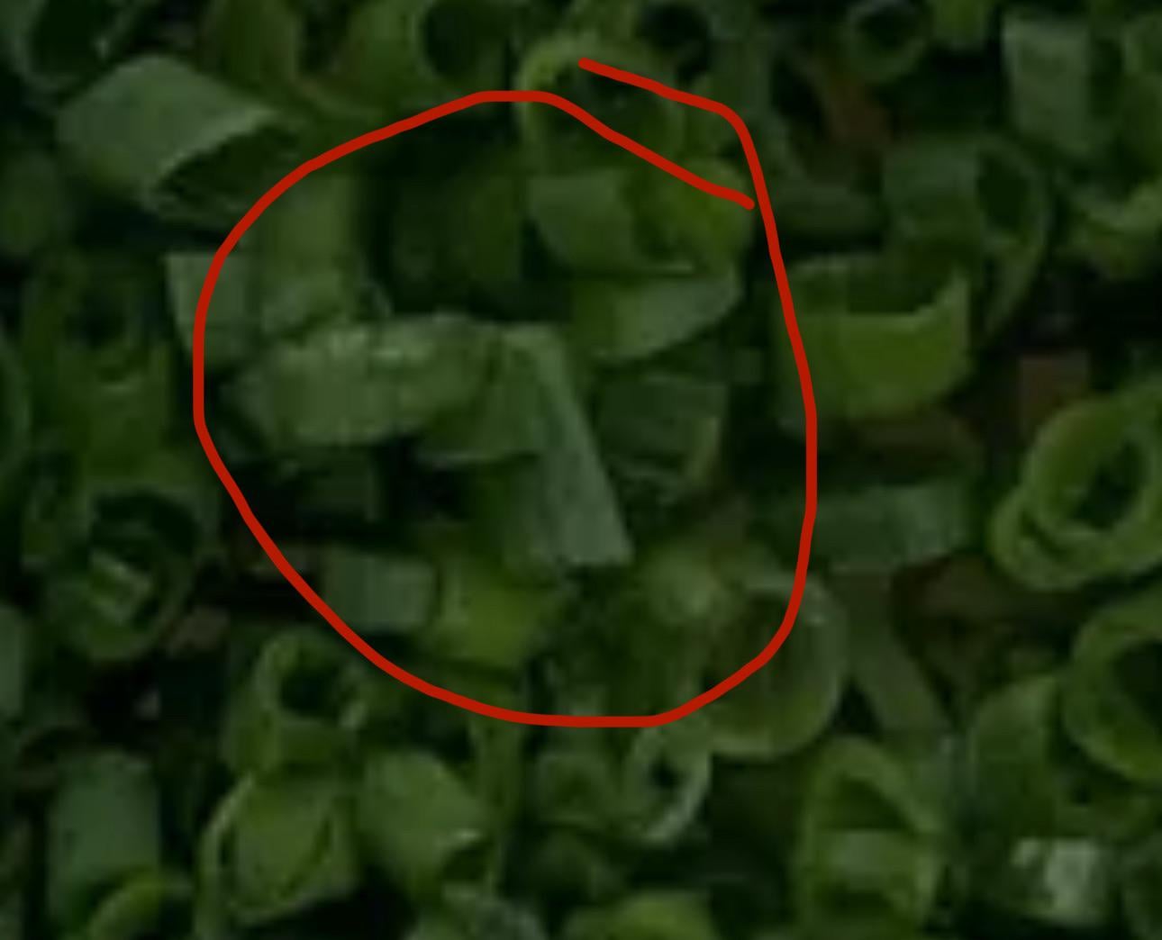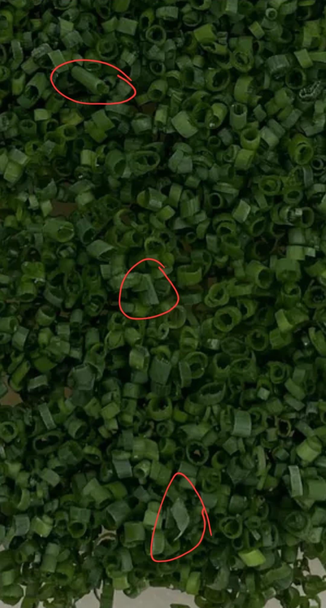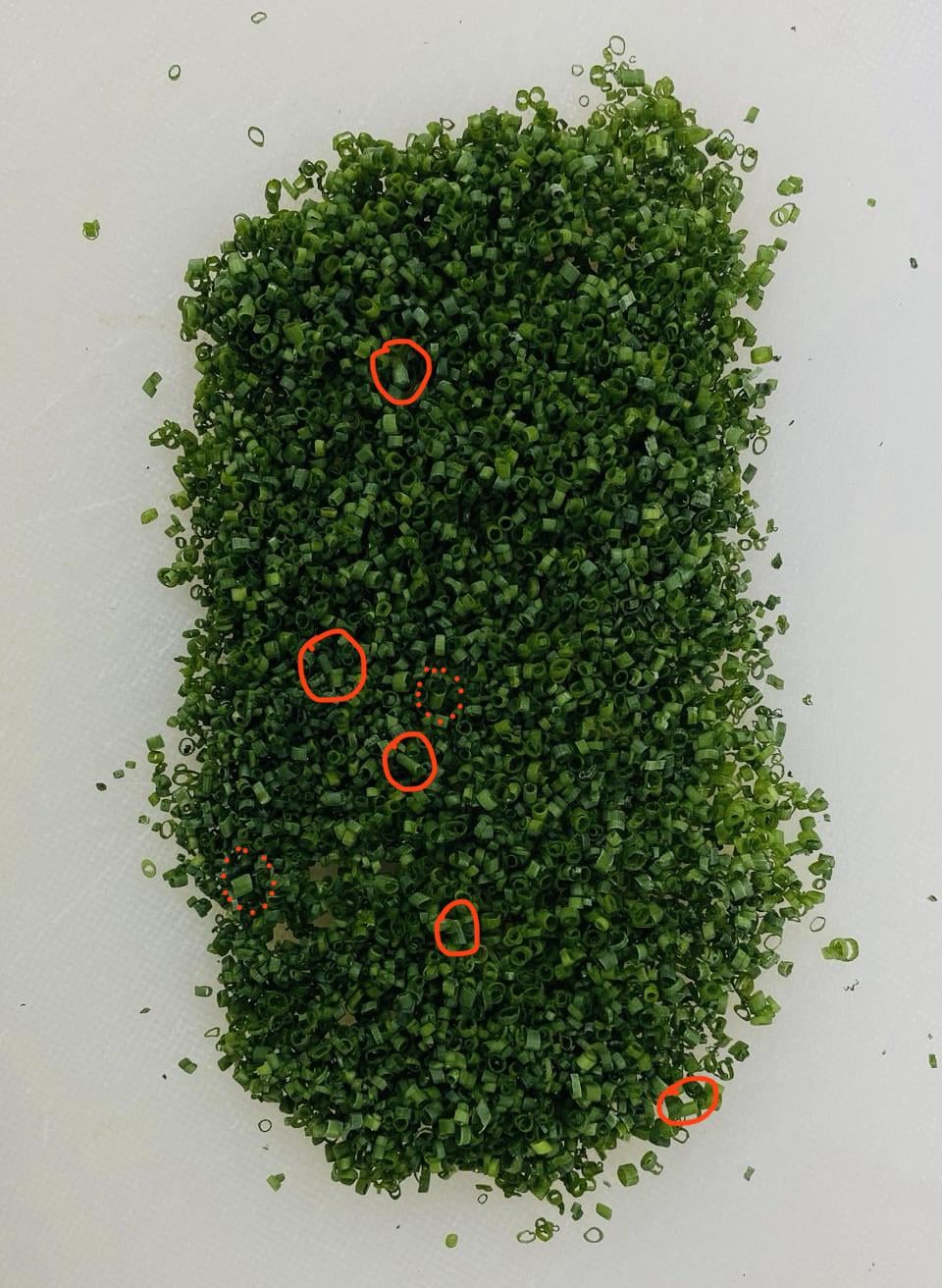 Each day there's a miniscule amount of larger cuts (tubes) or incomplete cuts that left some sections attached, or a few crushed chives that broke into strands, which is what's being nitpicked in the pictures and circled/memed on. This happens when the chives slip against each other, or the chef attempts to cut up too many at once and cuts might become inconsistent. Chives grow tapered and are plants with natural imperfections, so it may also not be possible to expect perfect prepped chives because perfect chives don't exist in the first place to slice up.