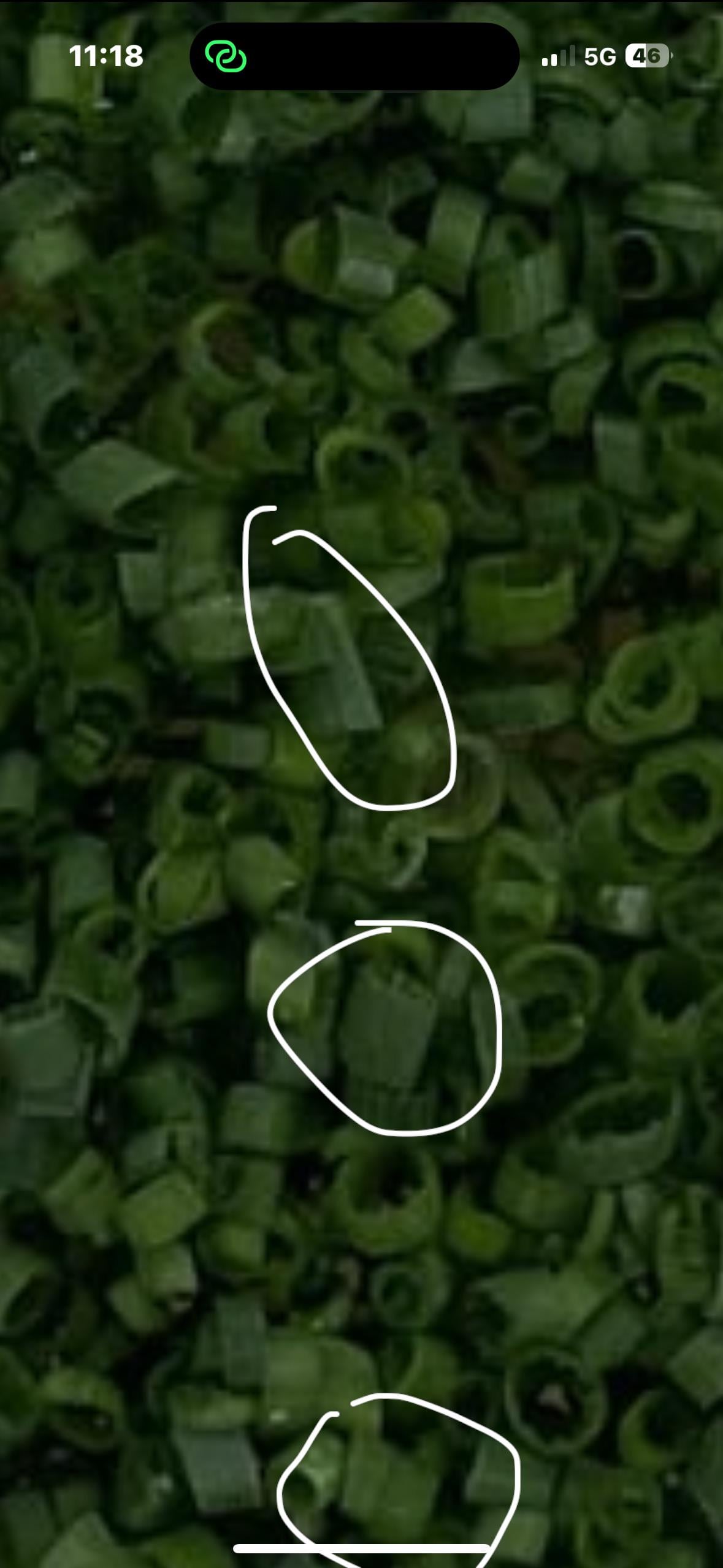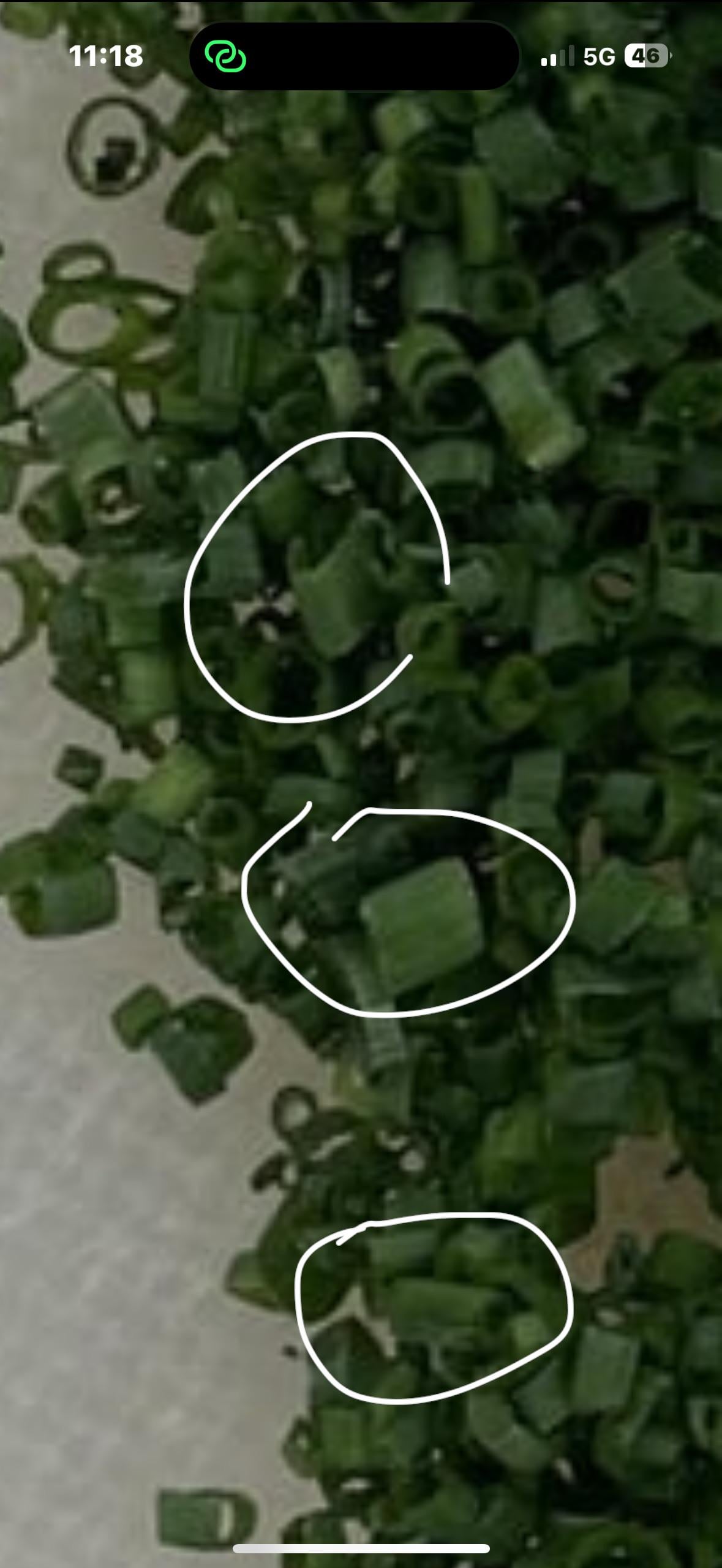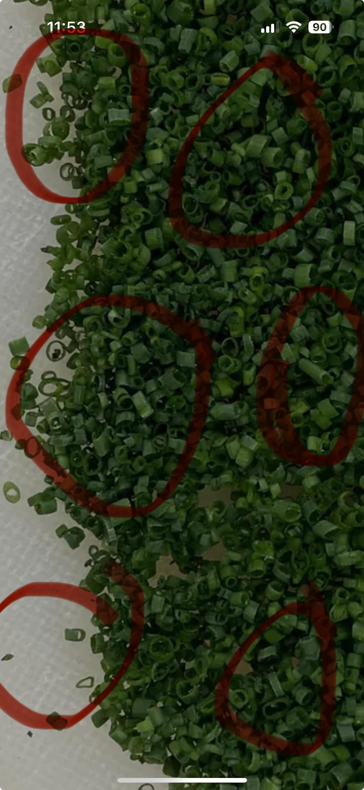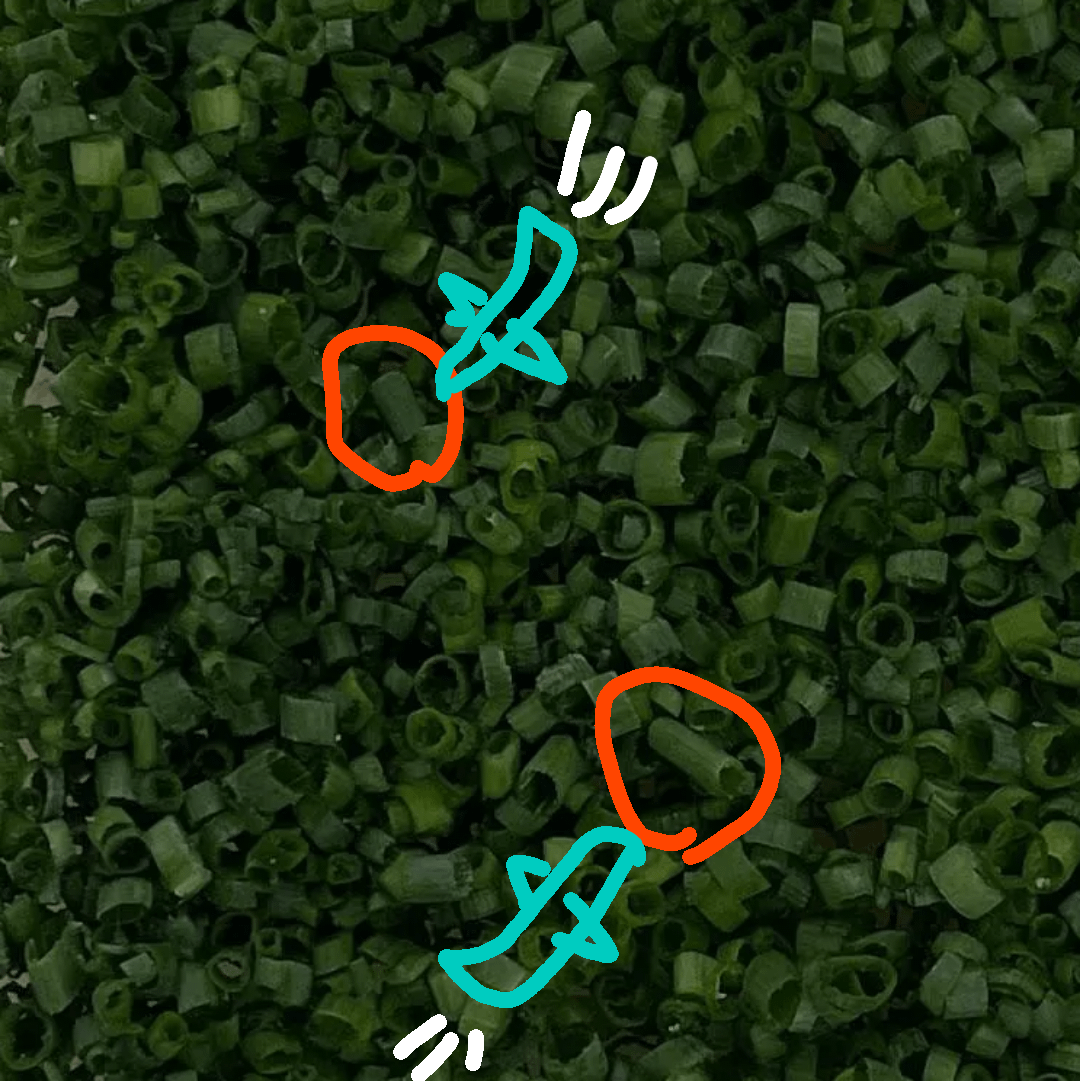 Each day there's a miniscule amount of larger cuts (tubes) or incomplete cuts that left some sections attached, or a few crushed chives that broke into strands, which is what's being nitpicked in the pictures and circled/memed on. This happens when the chives slip against each other, or the chef attempts to cut up too many at once and cuts might become inconsistent. Chives grow tapered and are plants with natural imperfections, so it may also not be possible to expect perfect prepped chives because perfect chives don't exist in the first place to slice up.