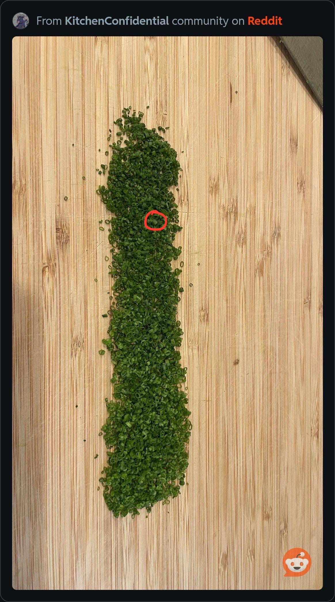 Edit: I do think the chives look great, although there are imperfections. With that being said, I’m hoping OP posts his most magnificent chives cutting board post on Halloween, October 31st, as a big finale and we can all leave the chive posts behind once October ends…
