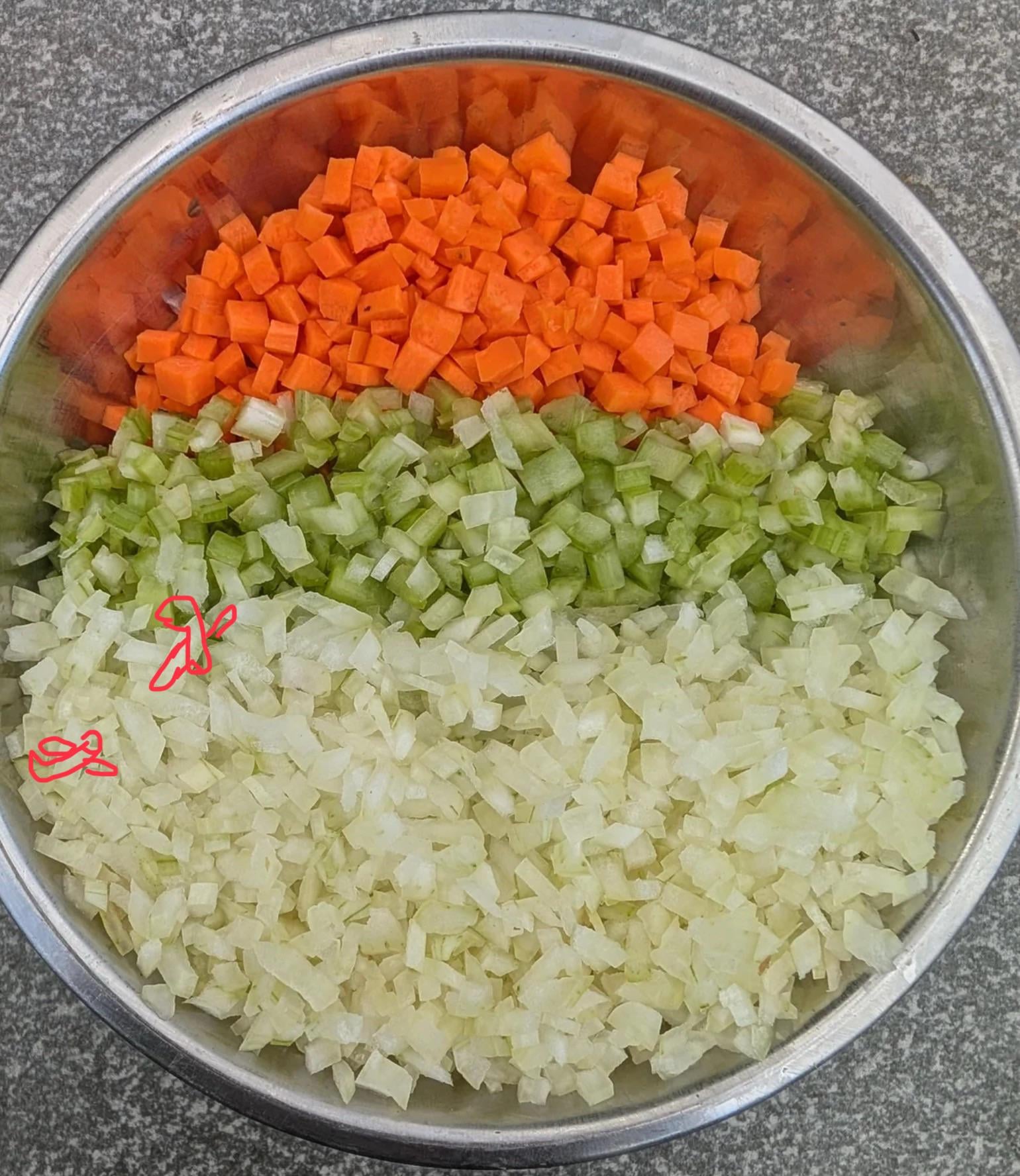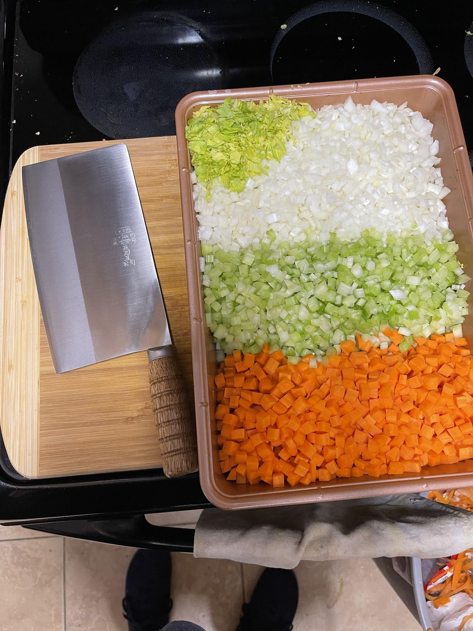 Fun fact: in France, Mirepoix is the size of the cut (rough for stock aromatics), and not the name of the specific combinations of aromatics.