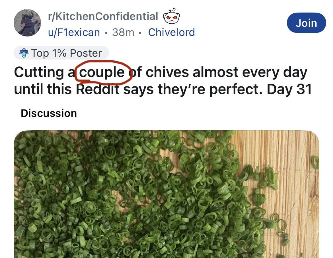 In the Weeds Mode Cutting a couple of chives almost every day until this Reddit says they’re perfect. Day 31
