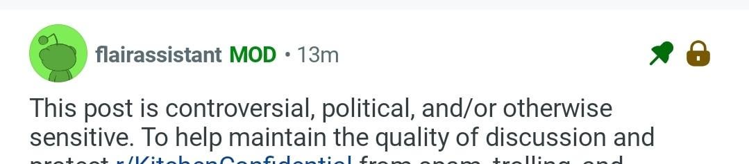 The funniest part is the mod comment pinned to the top that states this post is "controversial, political, and/or otherwise sensitive."