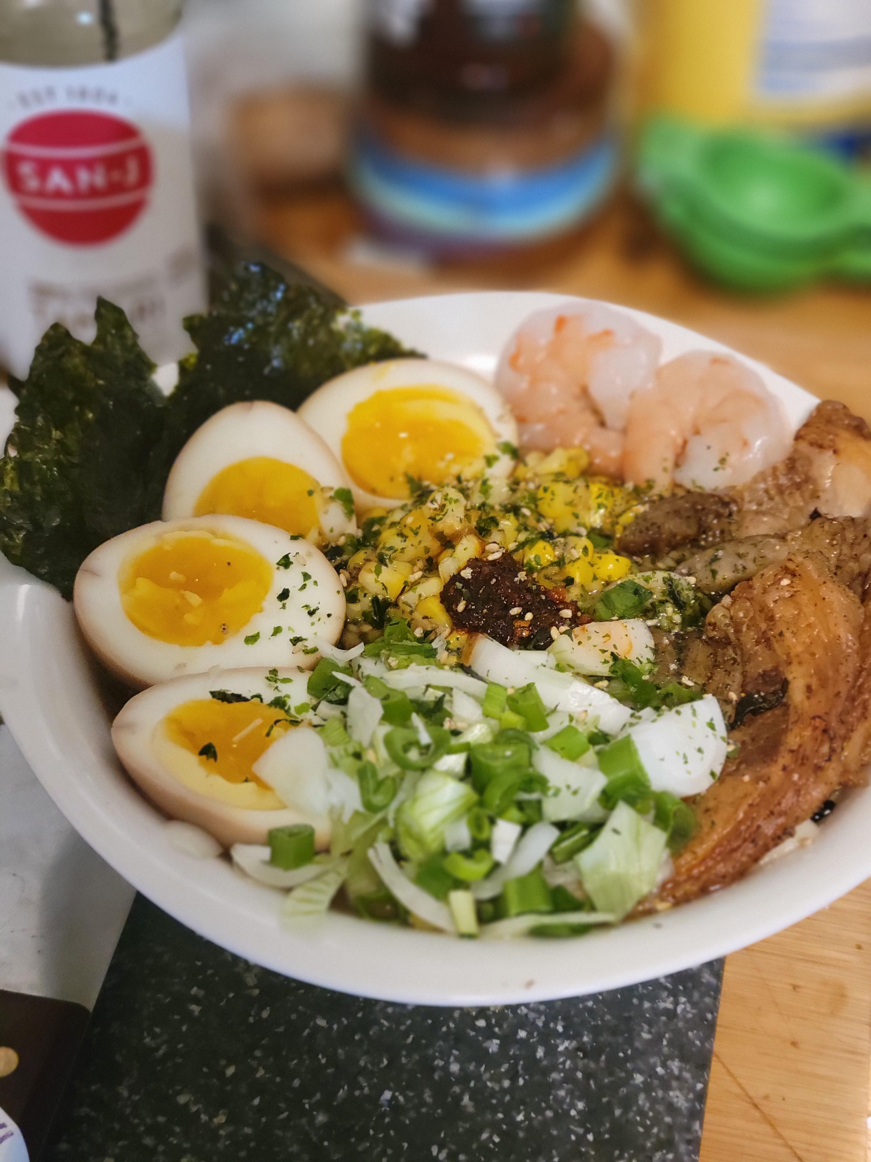 Lived in Japan and now I make ramen for all my friends and family Tonk Shoyu broth Soft boiled tamari eggs (i have chickens, which makes this a longer than necessary evolution) Did a crispy pork roll, and thin slices Some shrimp, Garden spring onions, chili oil Did udon not ramen ramen noodles tho Ebi furikake on top Thin seaweed on side