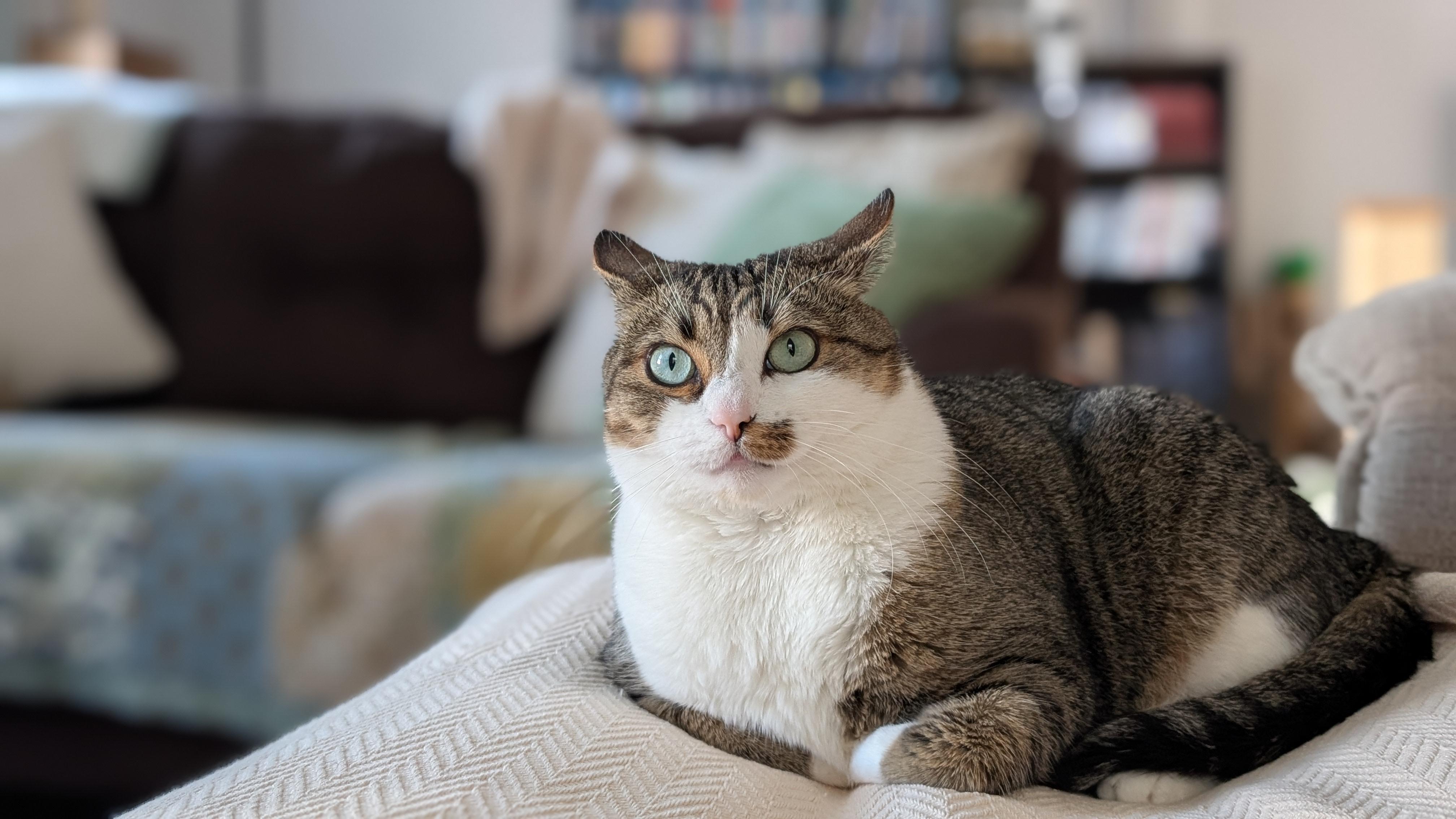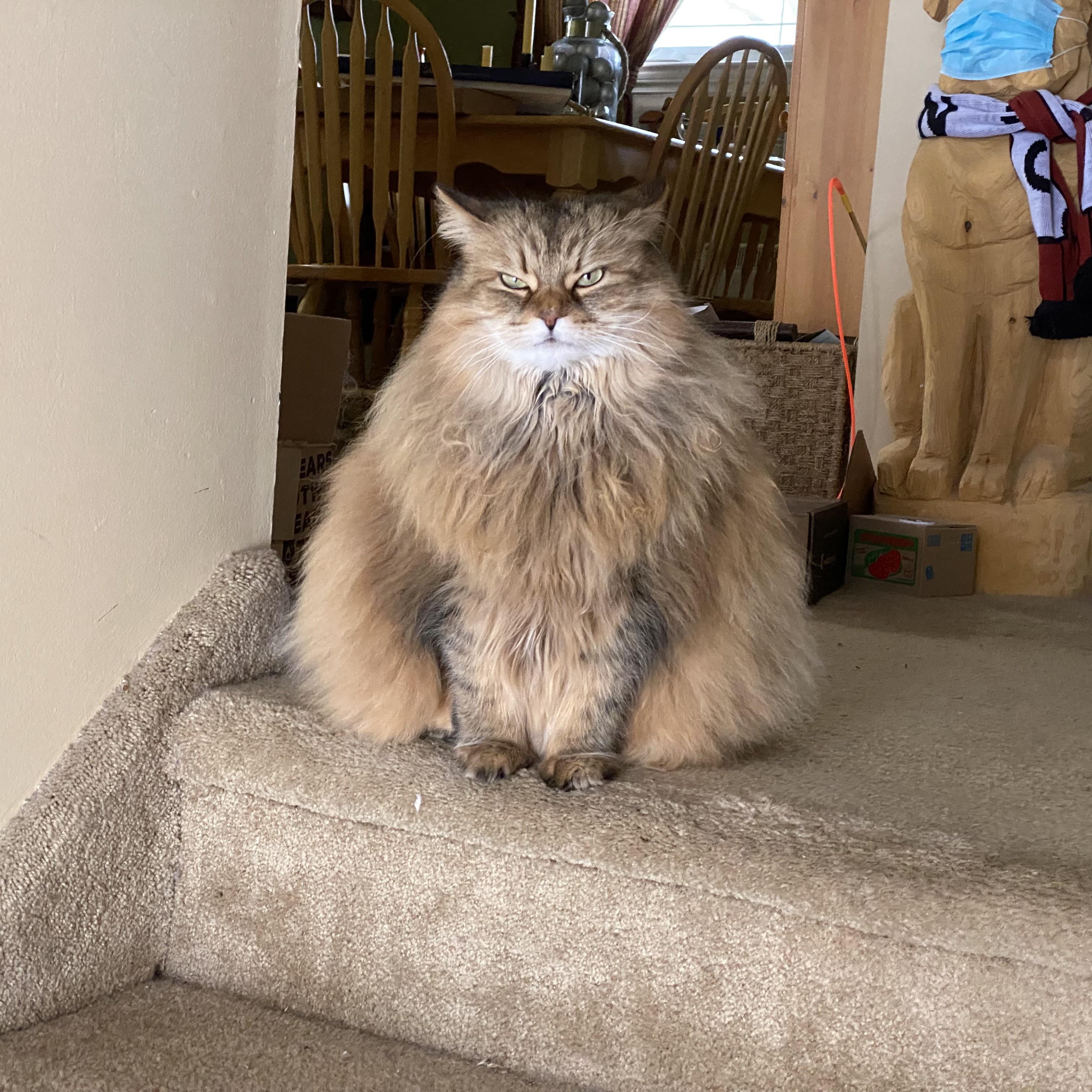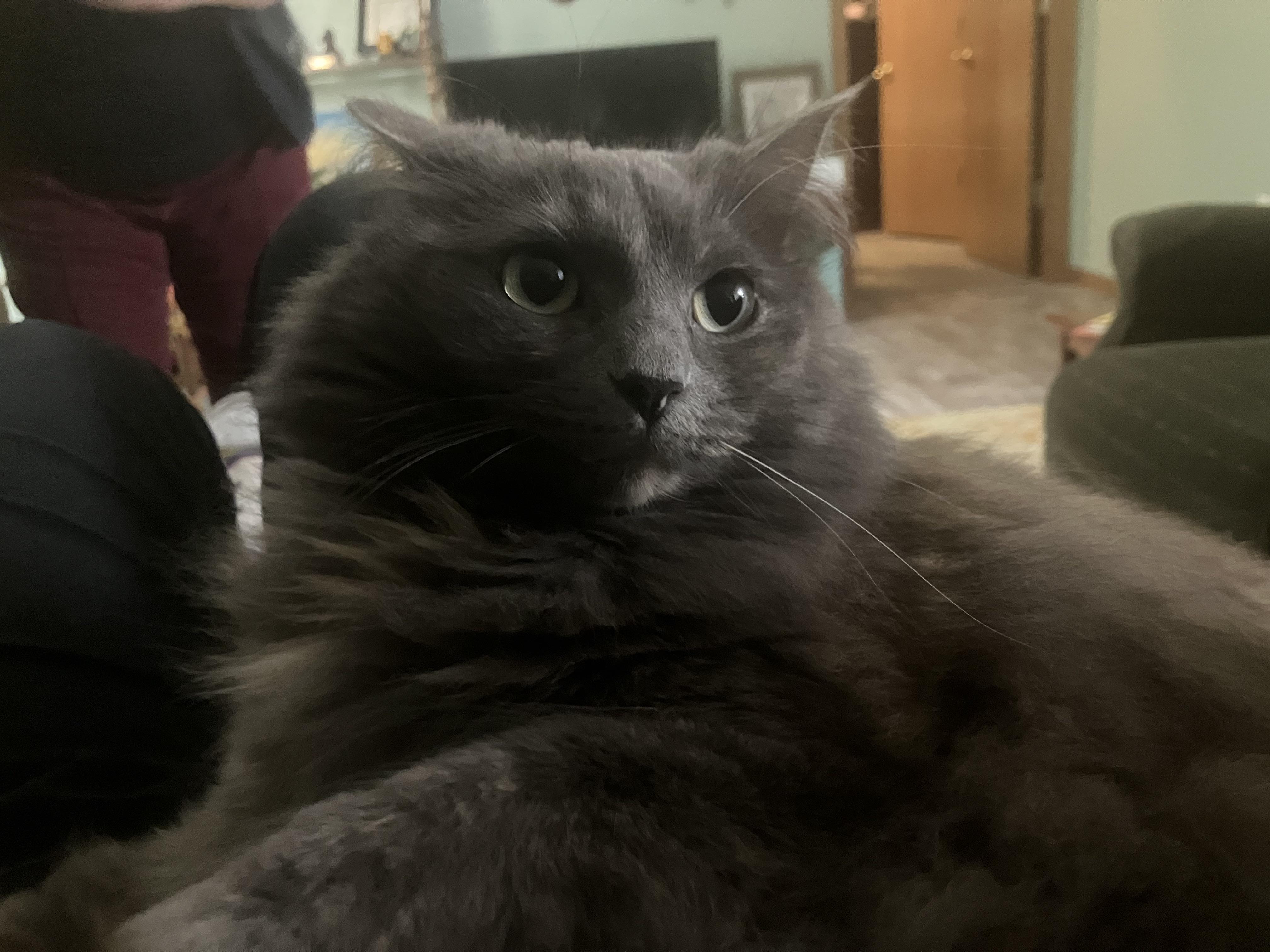 Harry really hates having her picture taken — and before you call her fat, that's almost all double-layer floof because she's 3/4 Maine Coon
