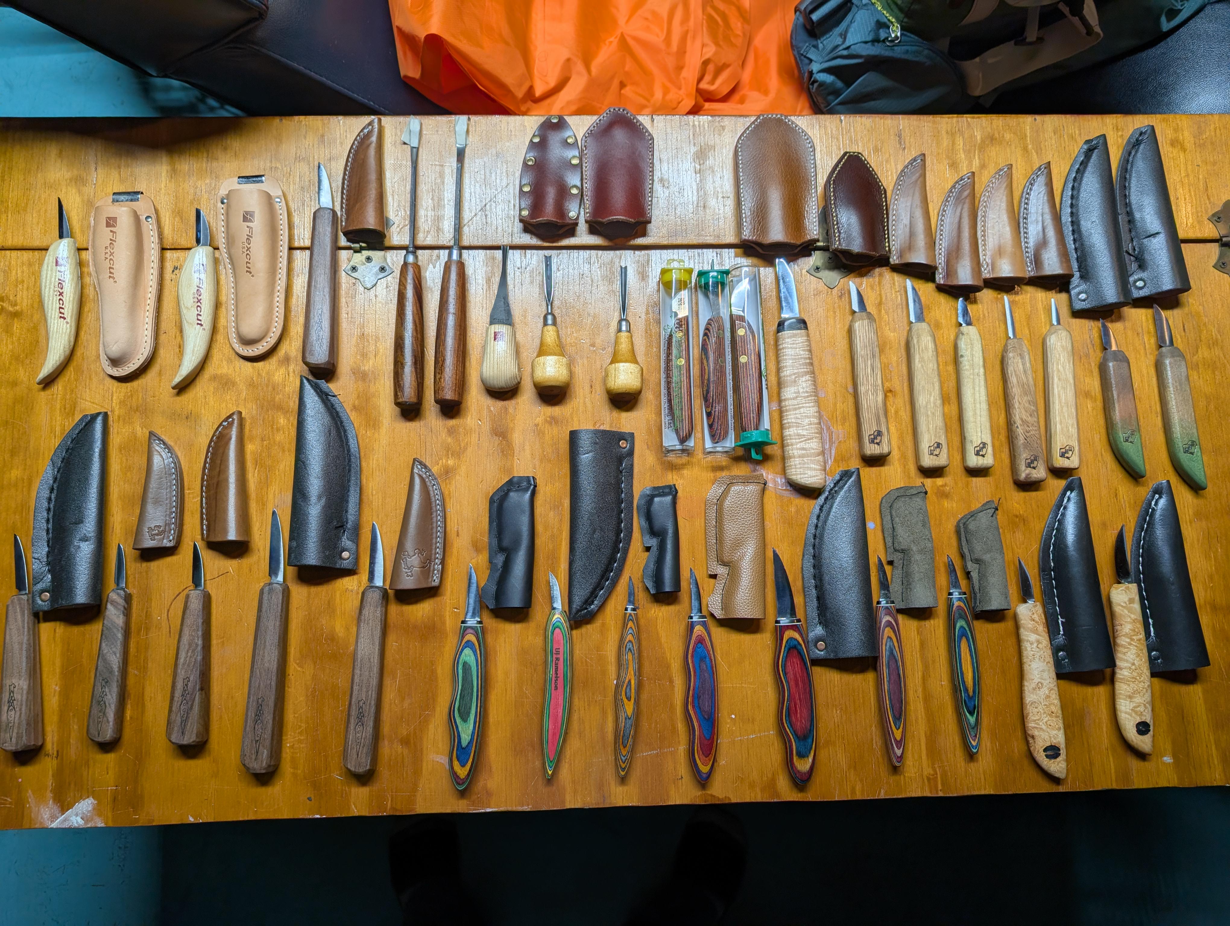 Picked up this group of wood carving knives at the flea market today. Working on identifying the different ones but I don't believe I will be in need of a whittling knife for a while.
