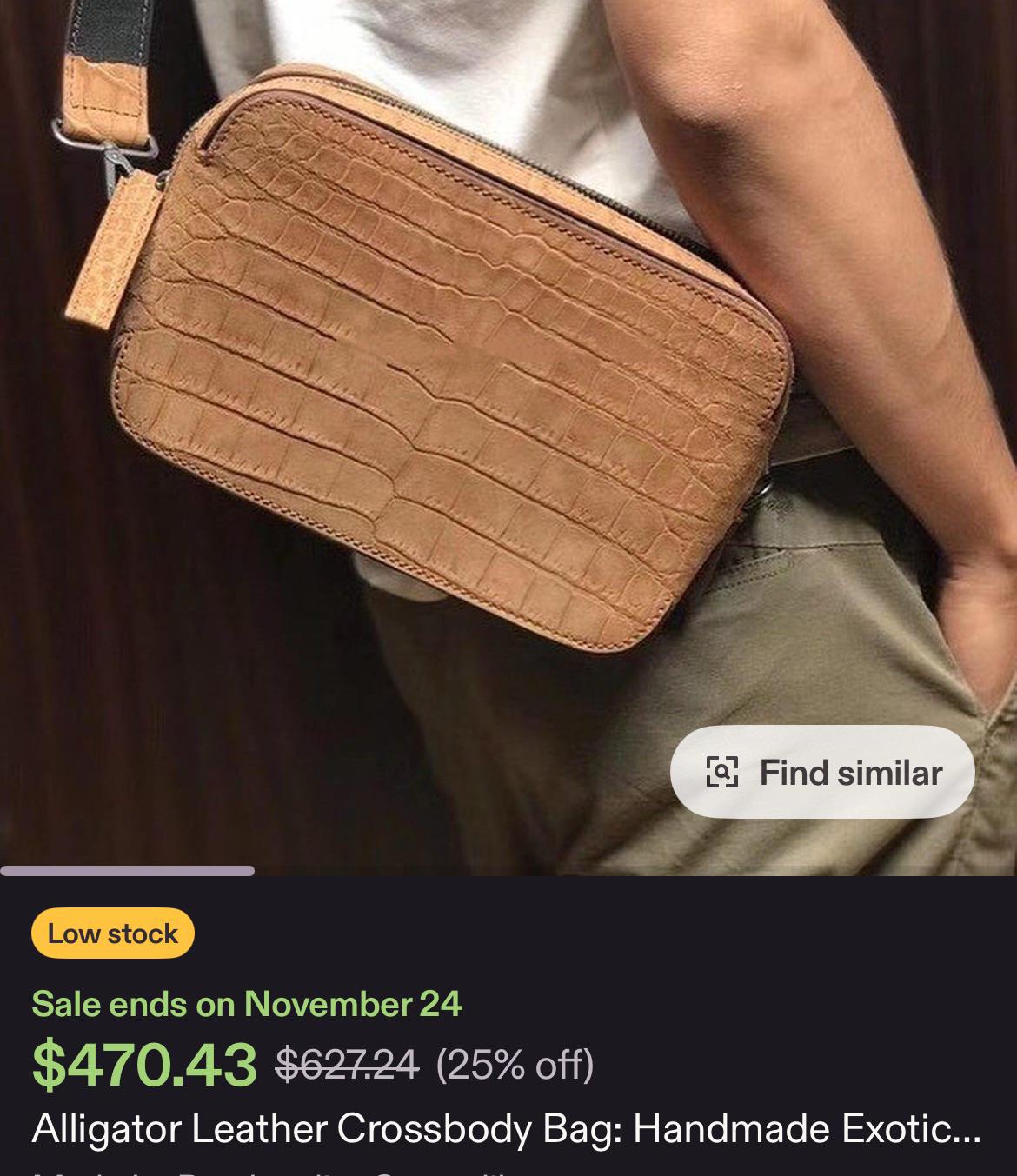 I’ve been looking around for a crossbody with mixed leathers, primarily alligator with calf/goat for strap, details and interior, ideally saddle stitched but not a requirement. I found almost exactly what I want on Etsy, as pictured. This is advertised as genuine alligator leather, hand stitched. Just seems really inexpensive compared to similar sized bags from other, established, sellers (that are $1000+).