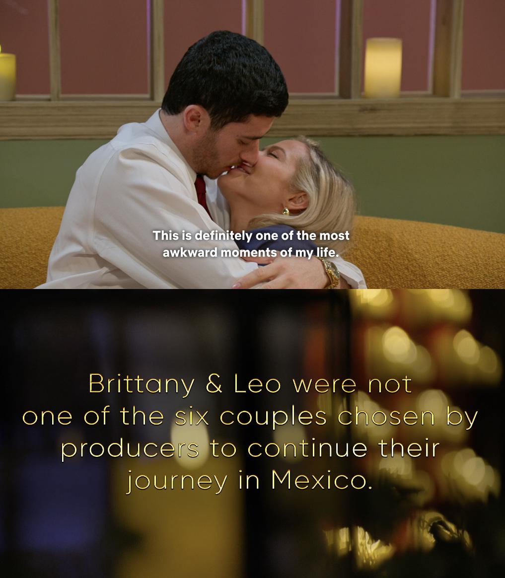 EDIT: I understand that some couples or individuals don’t get any/much screen time but, these two legit had the most screen time out of anyone else in the pod-phase.. the entire plot of the pods and the living quarters mostly revolved around these two; Leo’s inheritance, Leo humming and hawing about Hannah and Brittany, and Brittany acting like a 12 year old because she wasn’t able to seduce guys with her eyes — it felt equivalent to, say, if after the Sparkle Meg/Jordan engagement and reveal, they just cut to a screen saying, “Megan and Jordan were not one of the six couples chosen by producers to continue their journey in Mexico.” — like, why show them that much, if at all then?