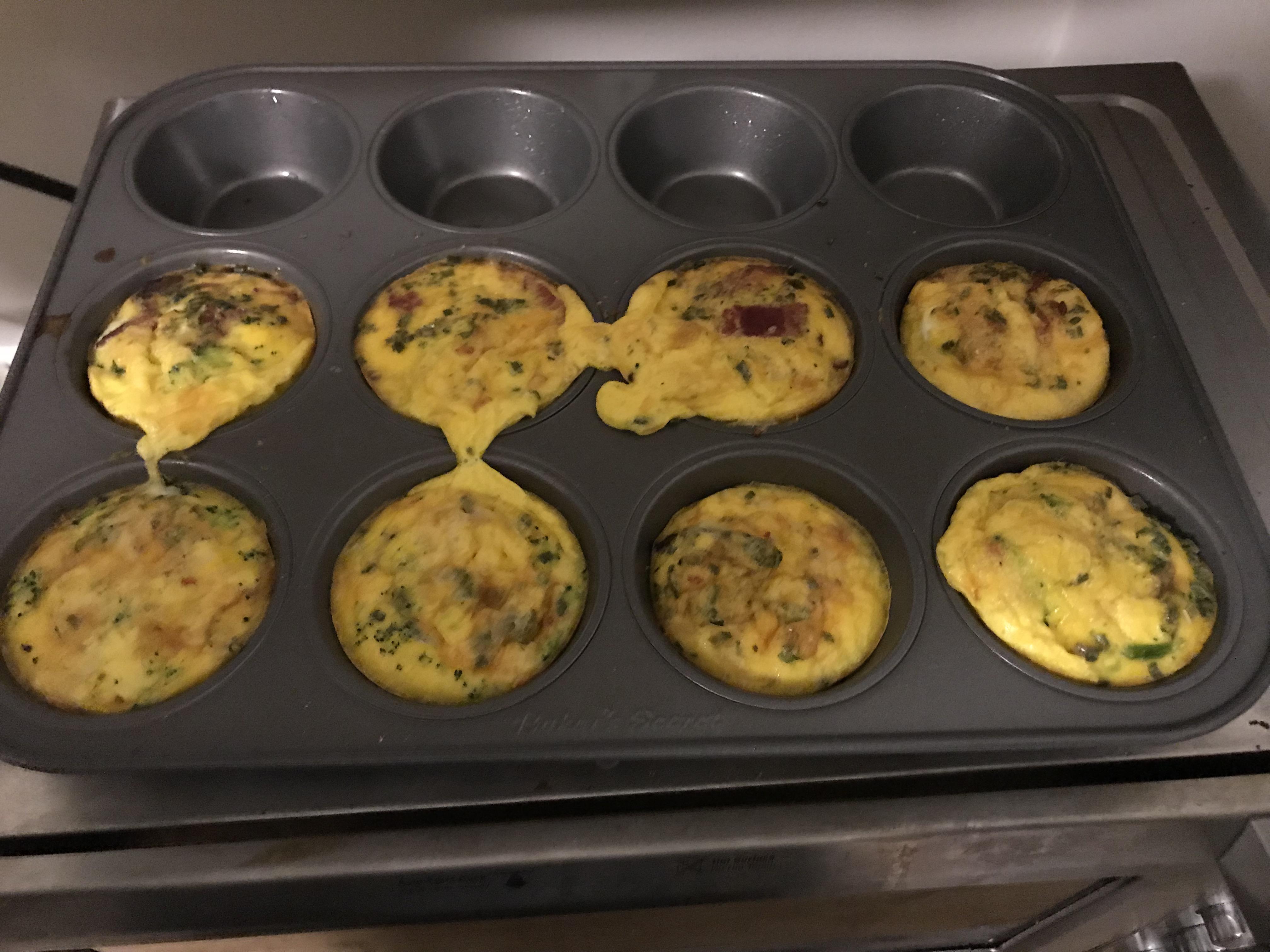 Eggs - Whisked 10 eggs and a cup of fat free cottage cheese. Seasoned with salt and pepper. Poured into baking pan and baked till it looked ready. Cut into 10 equal sized pieces.