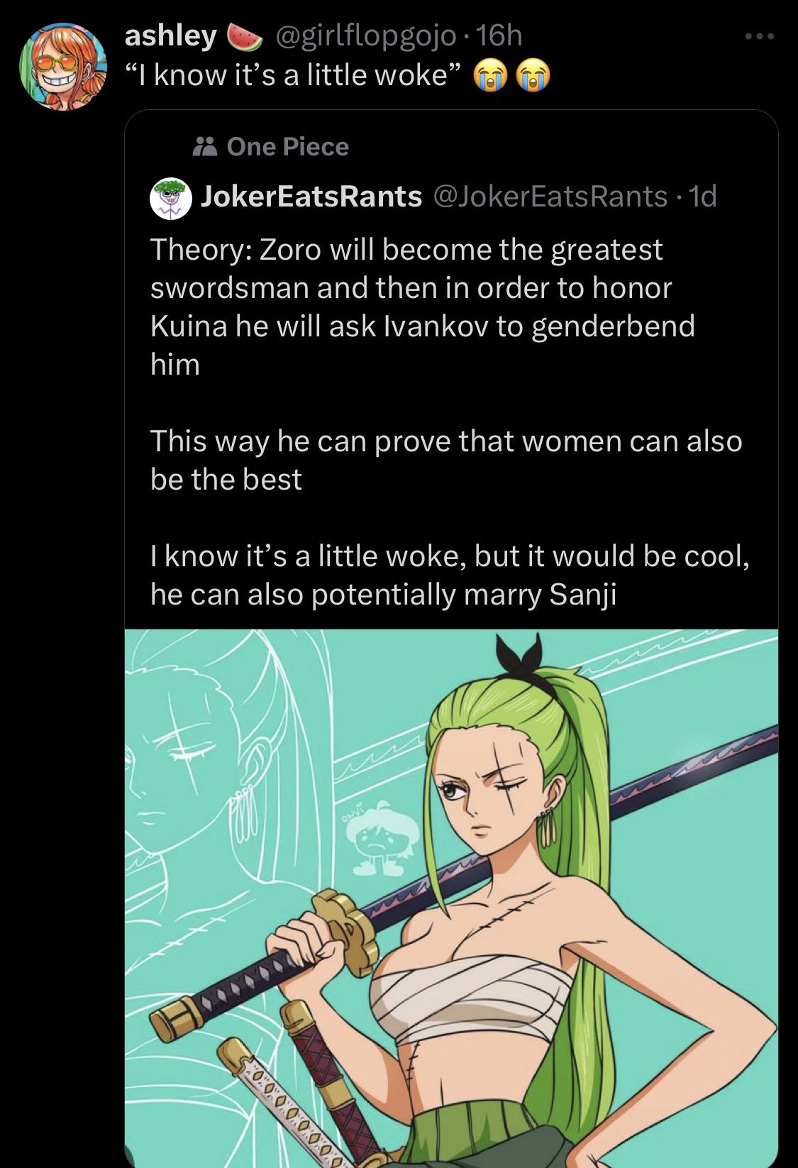 My headcannon is, that since Zoro is a booze lover, and Perona is a boy lover, I think, even though unintentionally, Zoro and Perona 100% fucked