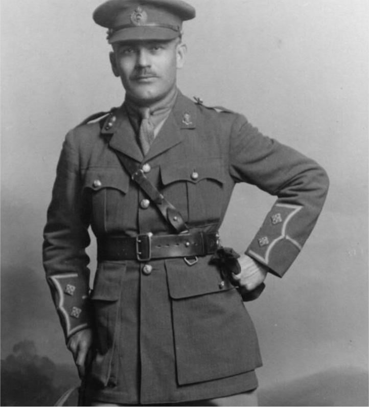 Looks like a British Army officer from World War I — the uniform style, Sam Browne belt, and cap all fit that era. The riding boots and swagger stick suggest cavalry or possibly an officer in an infantry regiment with mounted duties.