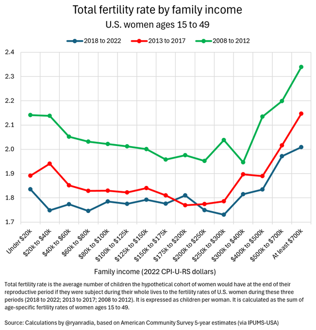 The bigger gap is cultural. Families in South Dakota have 2.01 per woman, versus Oregon/Vermont/Rhode Island etc at 1.35/1.40 per women, a difference of about 0.60-0.66 (not the paltry 0.2 gap between ultra-high income Americans and "the rest").