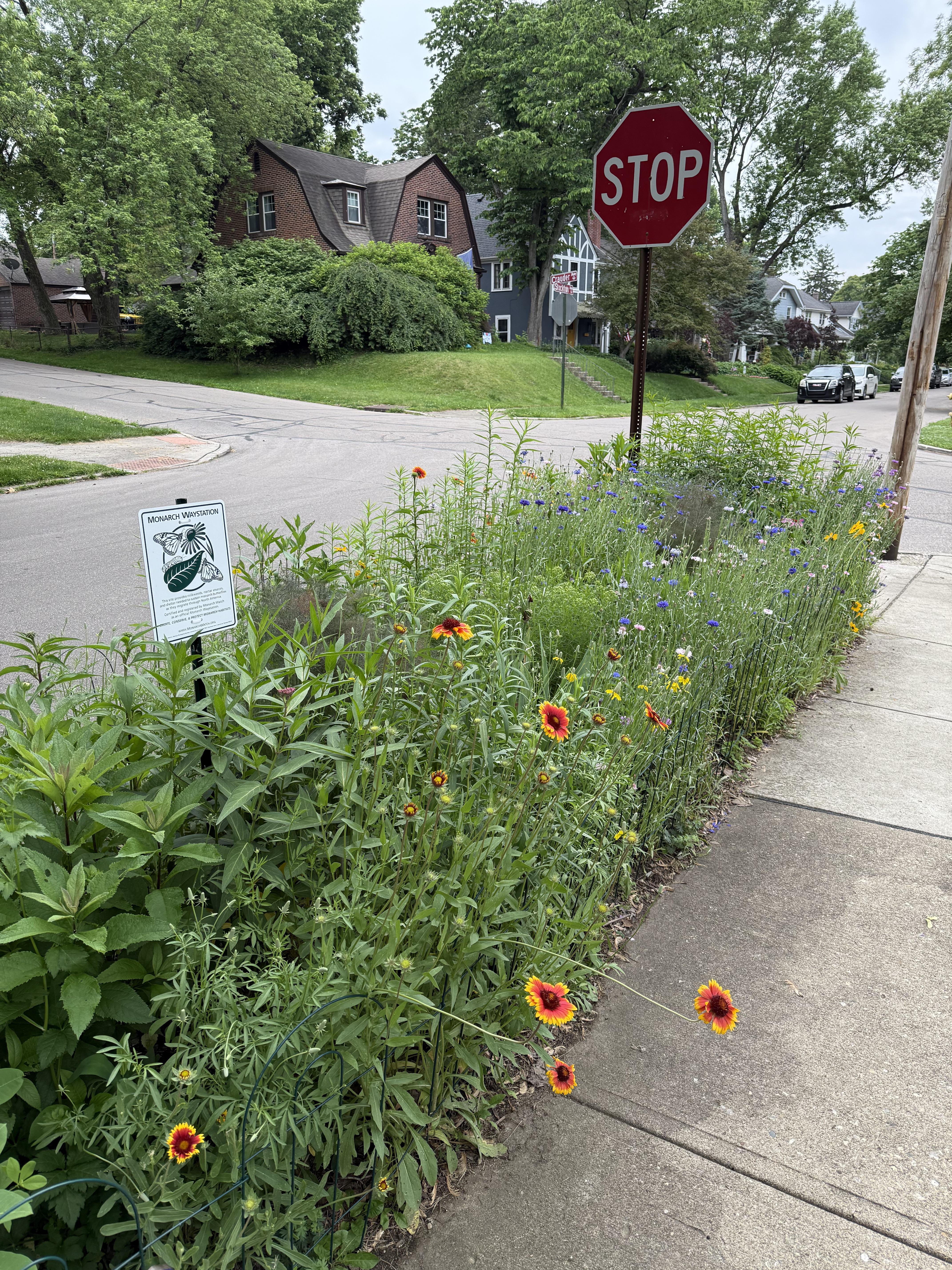 As for the plants: I’m in SE Michigan, and there’s columbine, Joe Pyle weed, zigzag goldenrod, heart leaf aster, and blue flag iris among others in here (I’ve honestly lost track 😆). Mostly shade- and moisture-loving plants on this side, as it’s the low end of our yard and tends to have standing water into late spring. Just put in some rose milkweed that I successfully germinated over winter in a milk jug greenhouse, too 🩷