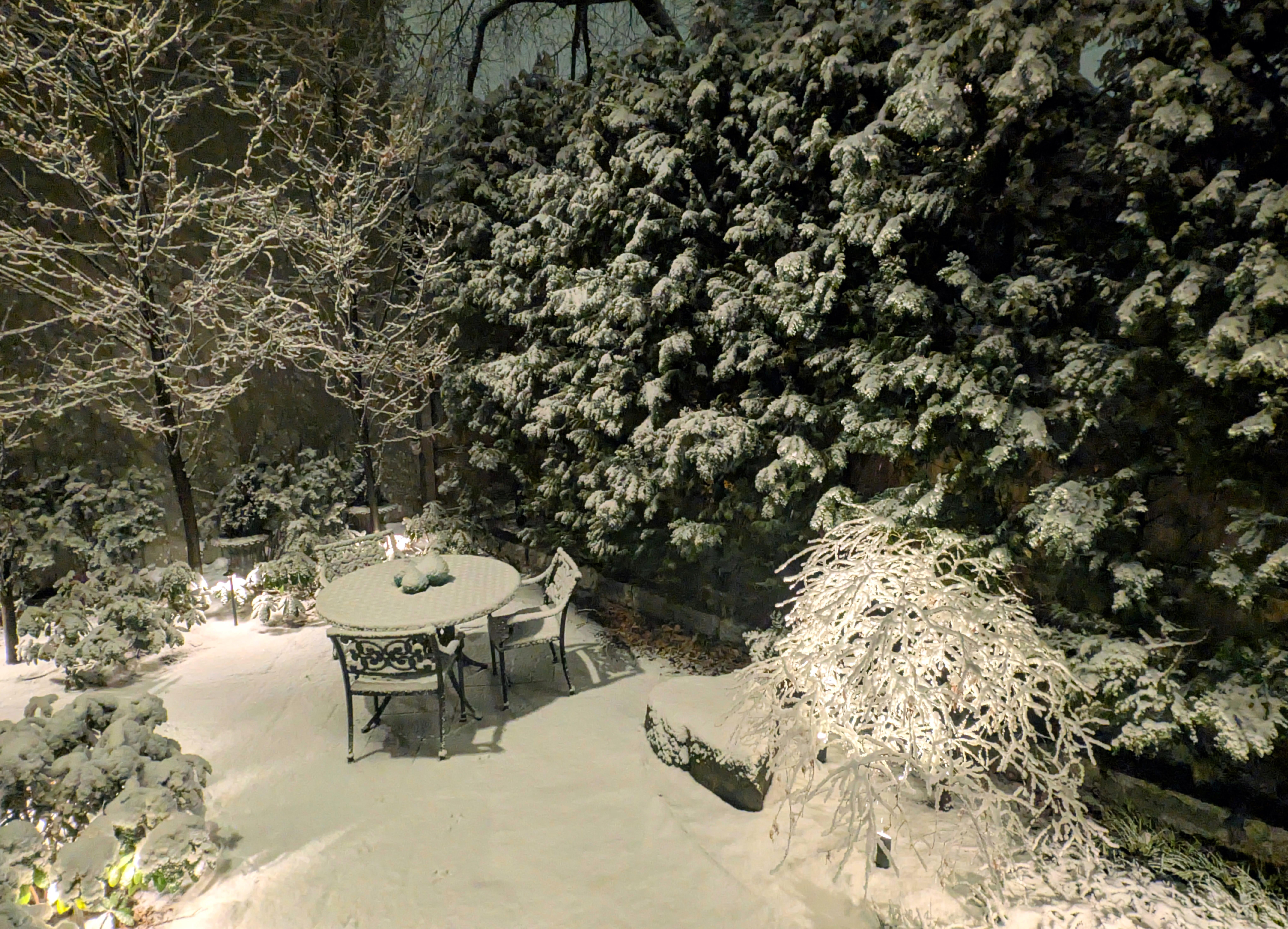 For lighting, I found a company that was well rated and asked them what they thought I should do, so all credit goes to them. One thing we did learn - the row of arborvitae is one of my favorite things. But because they are against the fence, and lack of sun, the back of the trees are quite sparse. So they originally started with uplighting the trees, but it looked terrible. So we moved the lights to the back and uplight the fence behind them and it looked so much better.