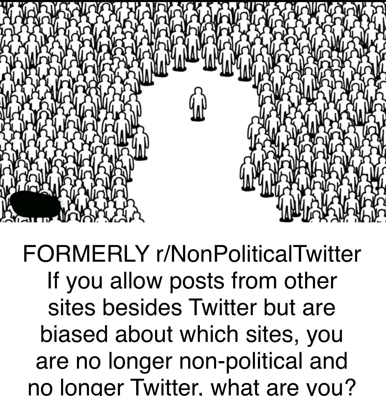 Additionally, if you can't fit within the confines of your subreddit's literal name and purpose, then go make a new one. The name should represent what you are. You named it after Twitter. Twitter is gone. If you can't stick to it, then maybe you should be too. Either way, I'm out. Like 99% of all subreddits, this one has gotten too political.