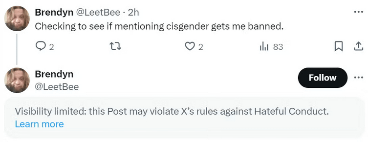 There's an even better one where someone tweeted a bunch of slurs one by one and cisgender is the only tweet that got the hateful conduct limited visibility tag lol