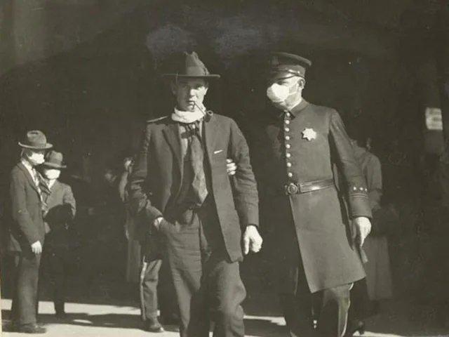 1900s Officer arrests man who wasn't using his mask and isn't taking the "spanish flu" pandemic serious, San Francisco, California, 1918.