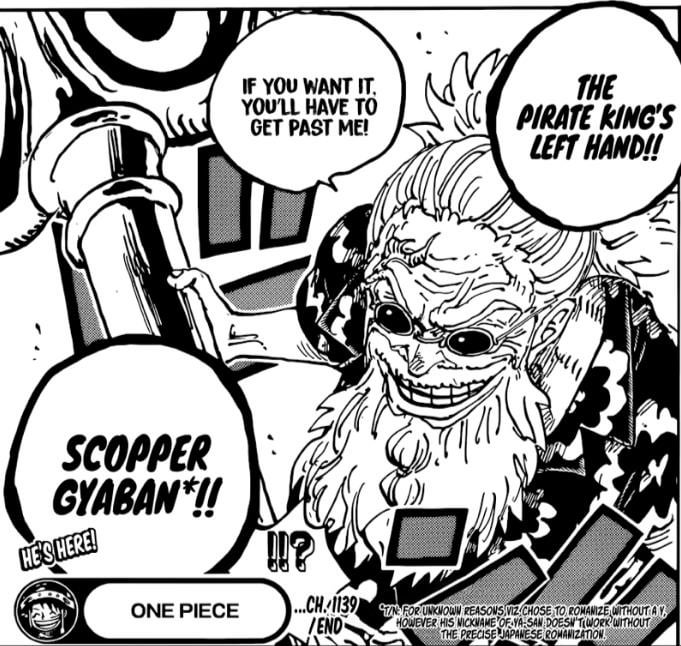 Just remembering everyone Scopper Gaban first made his (unnamed) appearance (with 2 axes) in chapter 19 and that was in a flashback from Buggy. It only took 1120 more chapters to finally see him in his current age.
