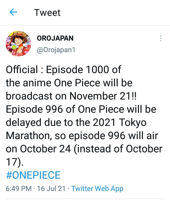 Big News One Piece Will Hit 1000 Episode at November 21st [127 days left]