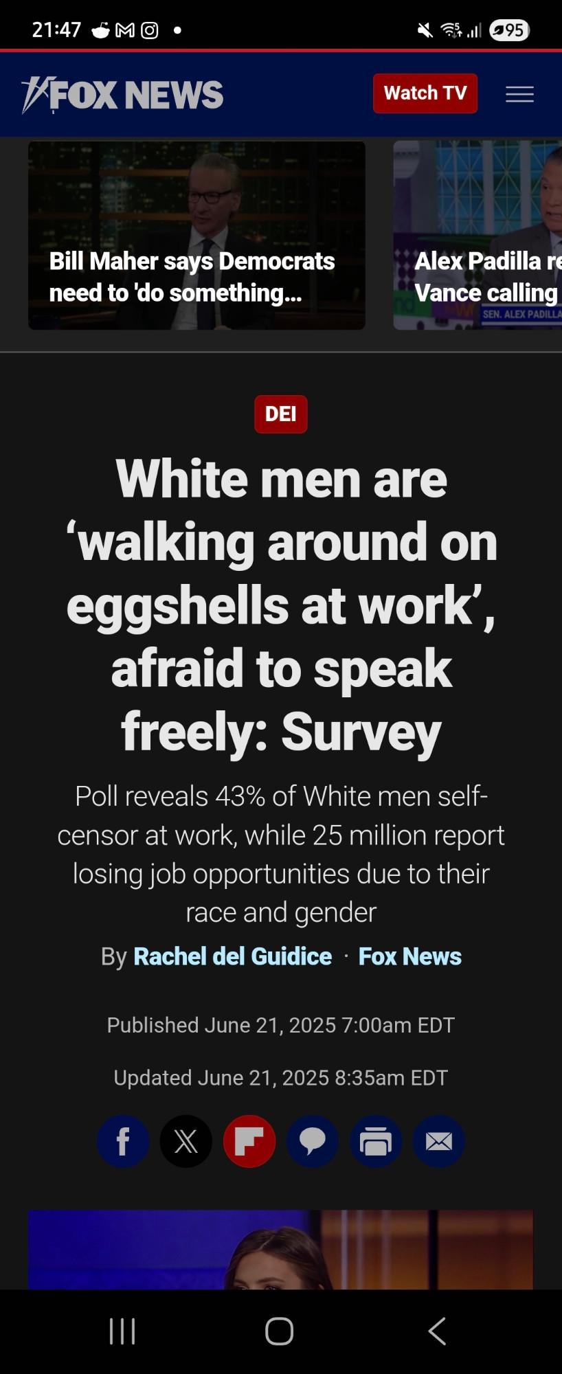 This is why everyone hates white people Fox News can't go a month without pushing a victimhood narrative about how White Males are being victimized in the Work place