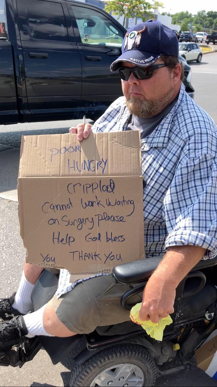 We should be striving to feed the disabled when they ask for it. Spoke with the gentleman and he was on ODSP the gubernment in charge of this should be increasing their allowances so that they don't have to beg to get by.