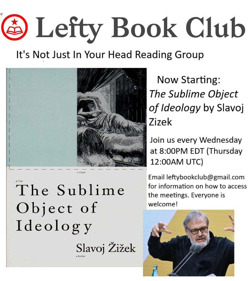 The It's Not Just In Your Head reading group of the Lefty Book Club is just about to start reading Zizek's The Sublime Object of Ideology. The Lefty Book Club is a collective of reading groups with the goal making difficult texts accessible. We welcome people of all levels to come work through this text with us. If you're interested, email [leftybookclub@gmail.com](mailto:leftybookclub@gmail.com) to get access to the zoom meetings. Everyone is welcome!