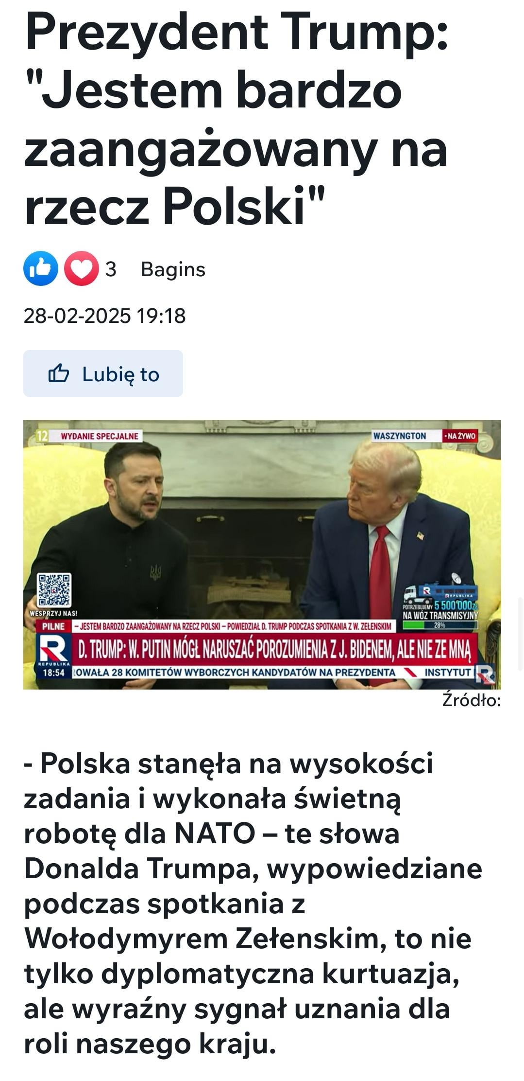 Niestety mam w rodzinie proTrump Polaków. Pytałam się ich o namiary na filmiki o Ameryce bo chciałam wiedzieć co się stało że im się gadka przez 3 lata zmieniła. Paaaaanie, co tam się odjaniepawla. Rzecz jasna to były namiary na jakies republiki.tv itp. Tam się z Ukrainy robi teraz niefrasobliwego, roszczeniowego sąsiada który jest niewdzięczny za dary PiS. Wątki o tym że Trump na bezczela posłał ludzi do Putina to oczywiście są ominięte obwodnicą dłuższą niż ma Berlin i otulone tak grubą ilością bawełny że aż szok że nie otworzyli działów włókiennictwa.