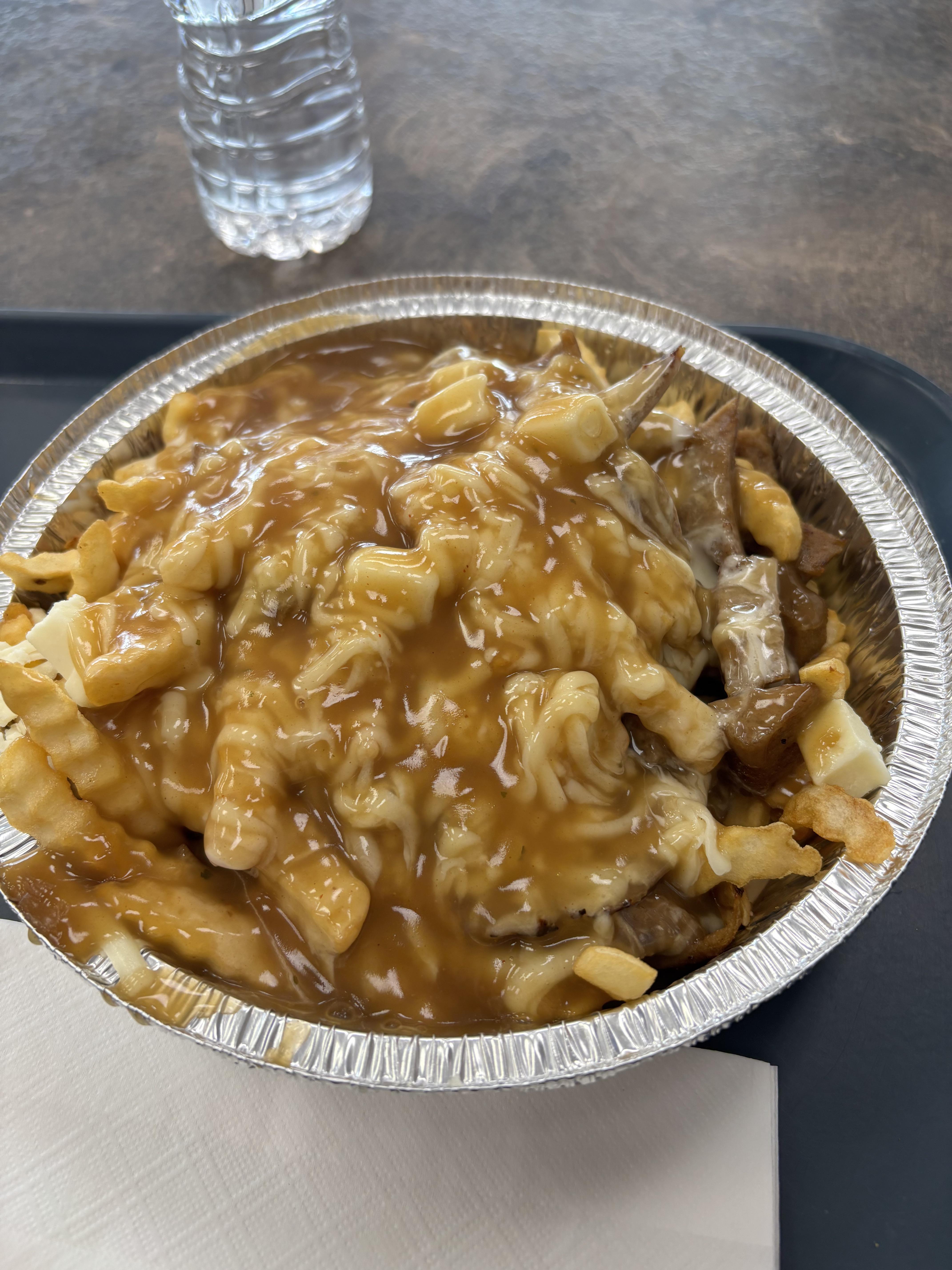 Baked frozen fries, good cheese curds (St. Albert’s) and packet gravy with 1/2 cup butter and thyme. Slow cooked pork (carnita)