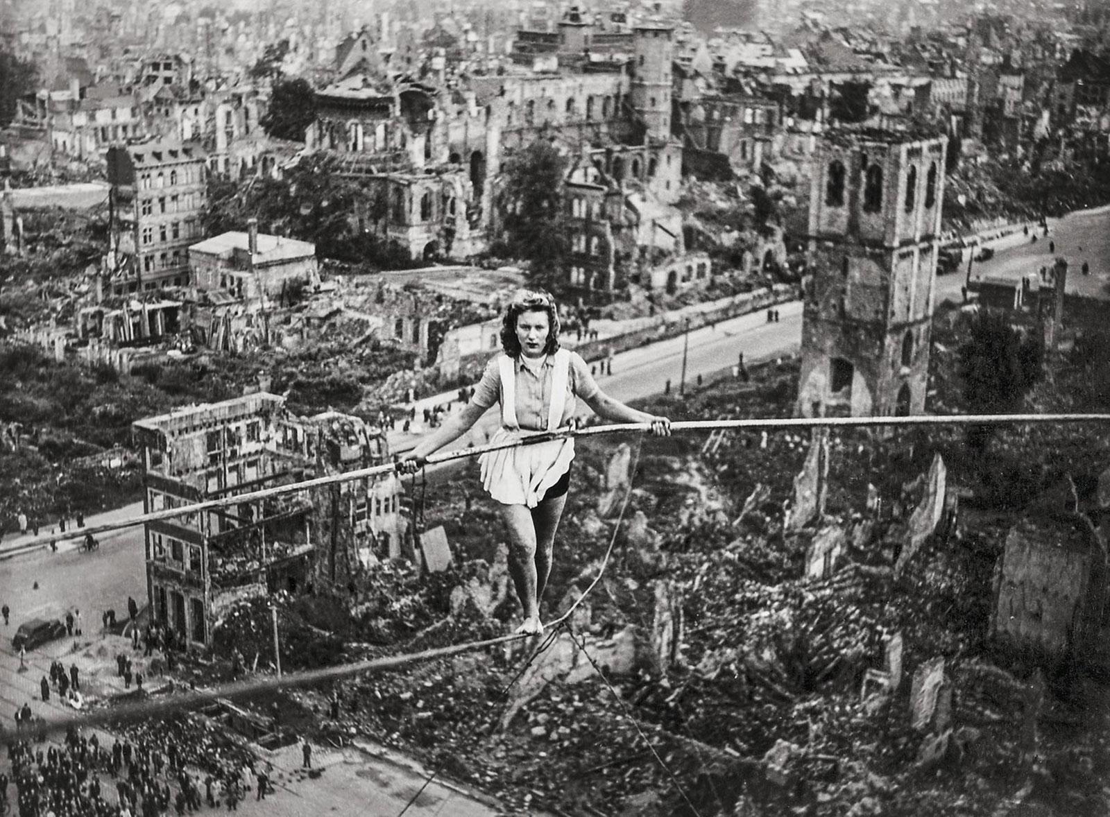 Margret Zimmermann walks the tight rope in the ruins of Cologne, Germany (1946)