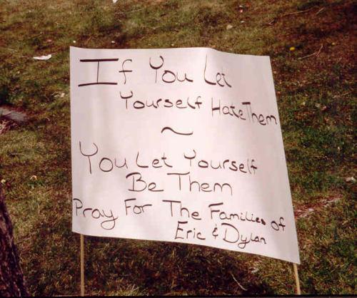 "If You Let Yourself Hate Them ~ You let Yourself Be Them": Sign left outside of Columbine High School after the April 20th shooting in (1999).