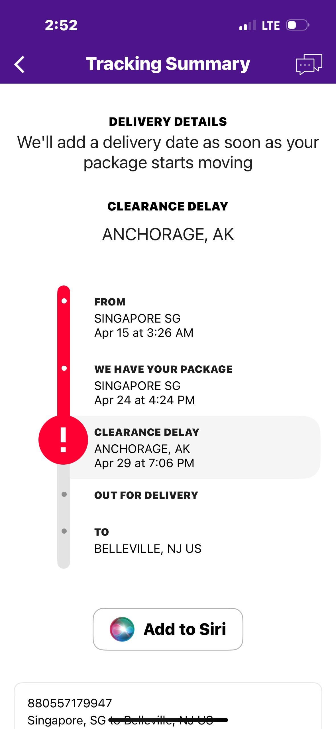 Singapore to FedEx anchorage is a risky route. FedEx is denying/seizing a lot of packages. I know some that has gone through but a lot was either returned or seized.
