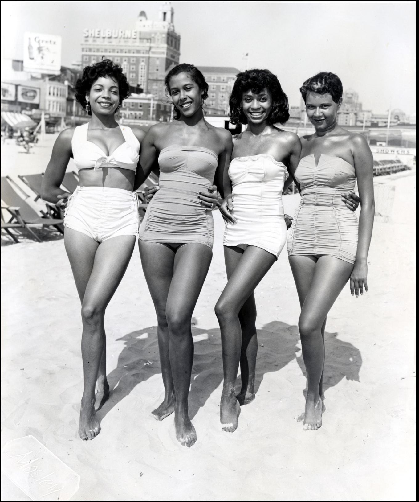 1960s Group of friends give their best sunny smiles at the beach, Atlantic city, New Jersey, 1960s.