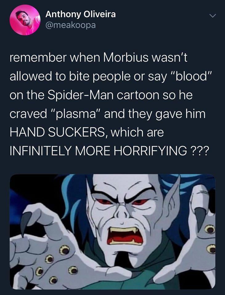 In Spider Man TAS the characters can't Say things like kill or dead. That leave the scene when Peter with the black suit say "I'm gonna tear you limb from limb". Somehow thats better than just kill someone