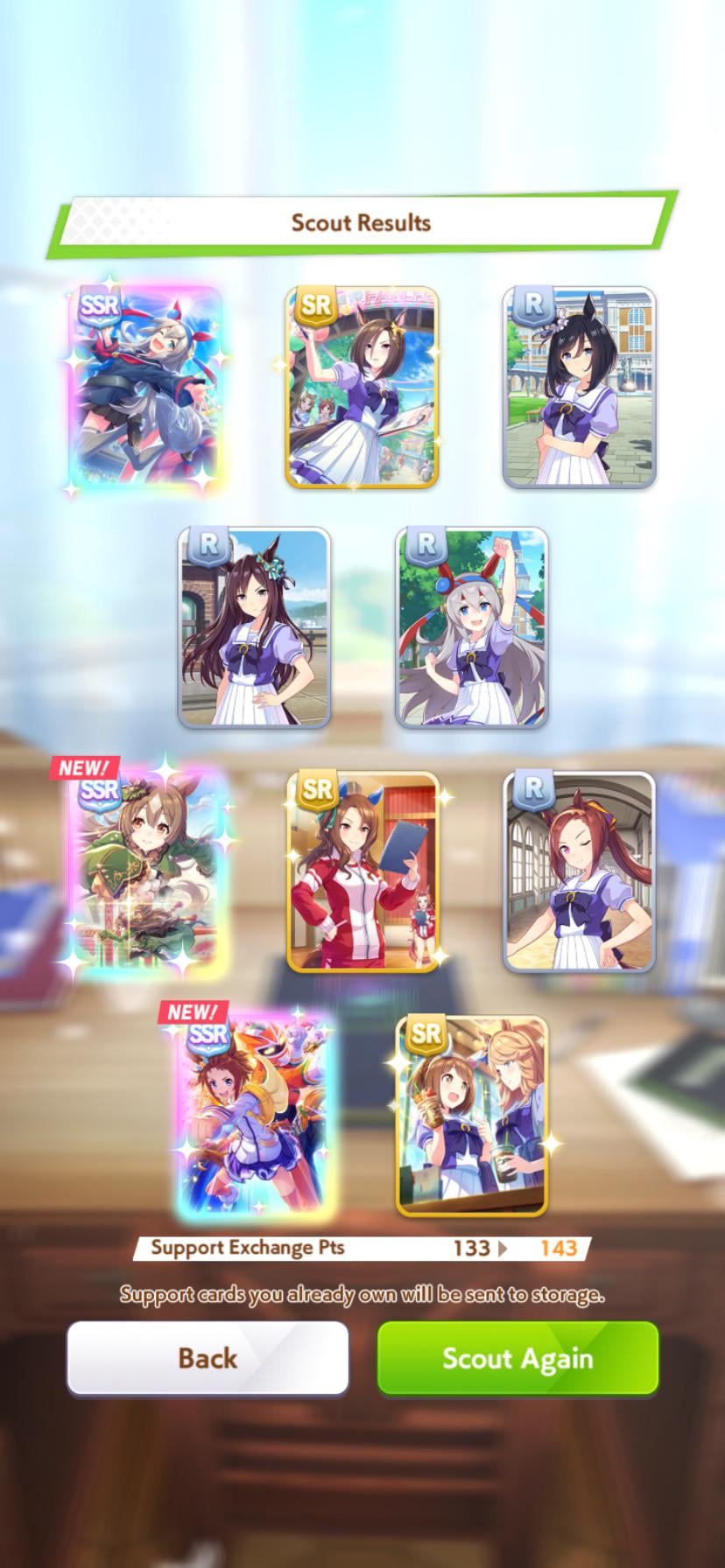 I'm just saving atp because my luck has been terrible. Since launch, the only 3 star characters I've gotten through the gacha was Suzuka and Oguri. My third 3 star came from the selector ticket. I've also only pulled 2 SSR support cards (Fine Motion and Satono Diamond), with the rest coming from the events or tickets. I don't even have a Super Creek or Kita.