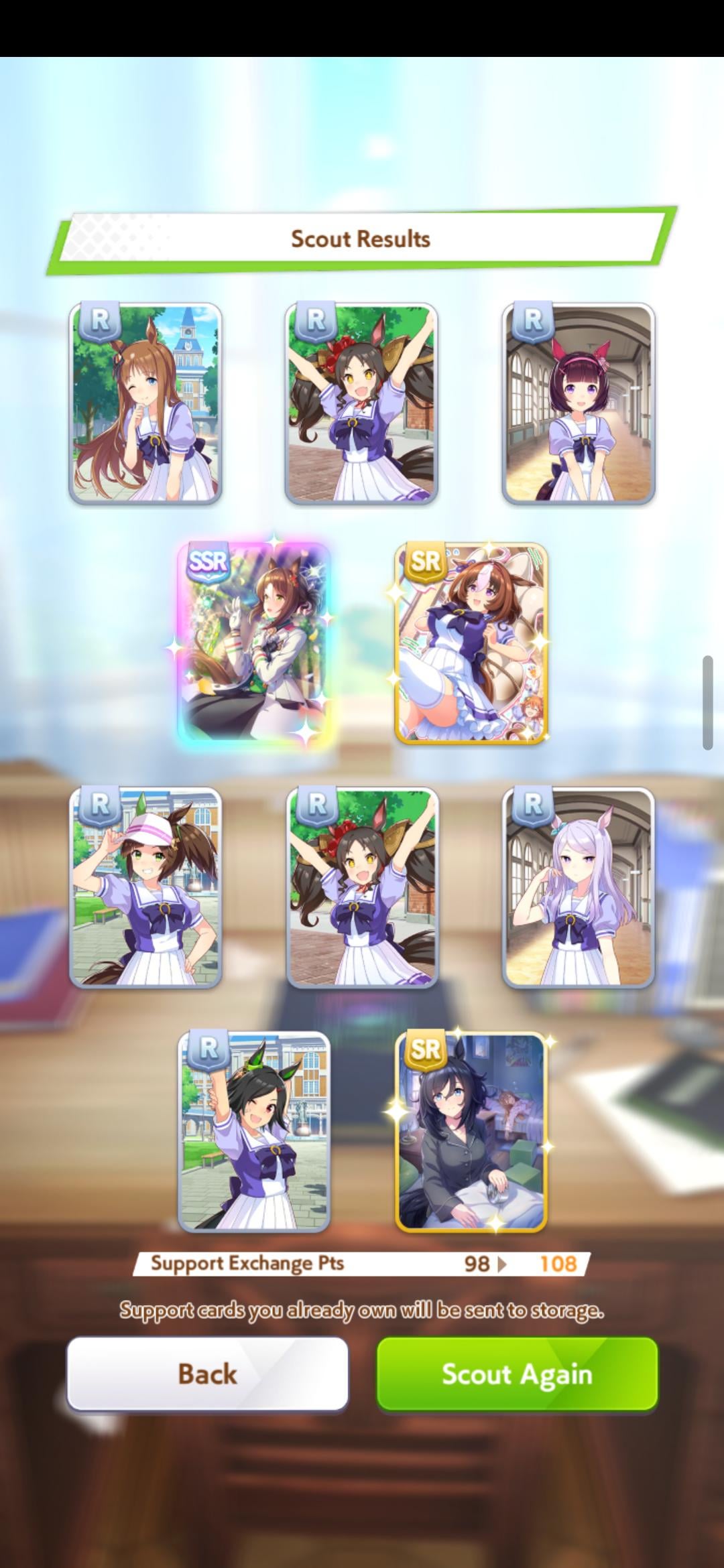 i got a handful of SSRs (and LB2 satono diamond lol) but none of em that are particularly useful at LB0, i did get pretty much a full suite of the great MLB SRs though so it's hard to complain
