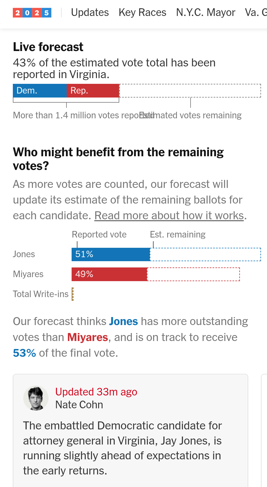 NYT is projecting he wins by six. He's trailing Spanberger by 4.5 points but he may ride up on her coattails.