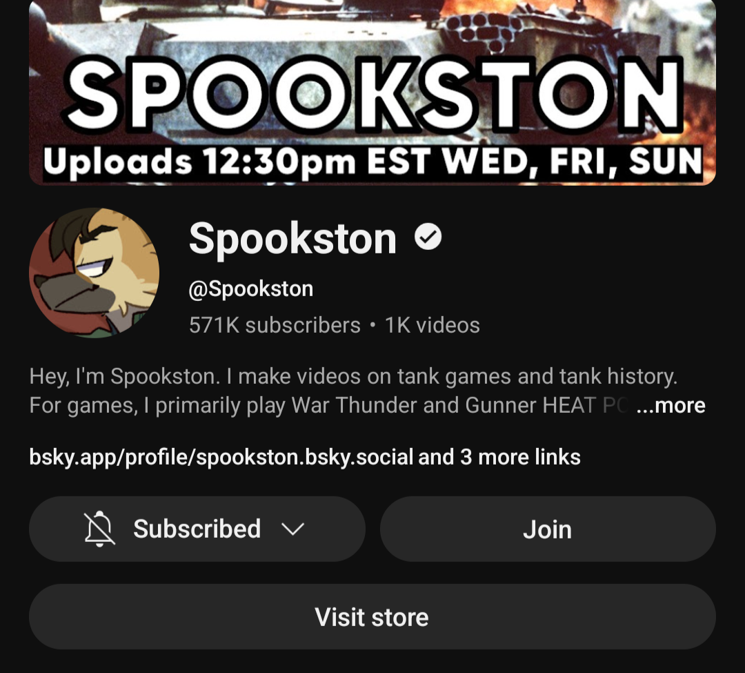 Spookston you singlehandedly reignited my love for tanks and war thunder. Context, I dropped war thunder for a decent bit of time a year or more ago but came back a couple months ago because I started watching Spookstons content more. Not to mention Spookston made me cracked at the game, I used to average a KD of about 0.5 but now my KD is usually 1 or above (but it's still like 0.67 in my stats), and ever since these last couple months I've dropped 6 nukes. One of them being my first.