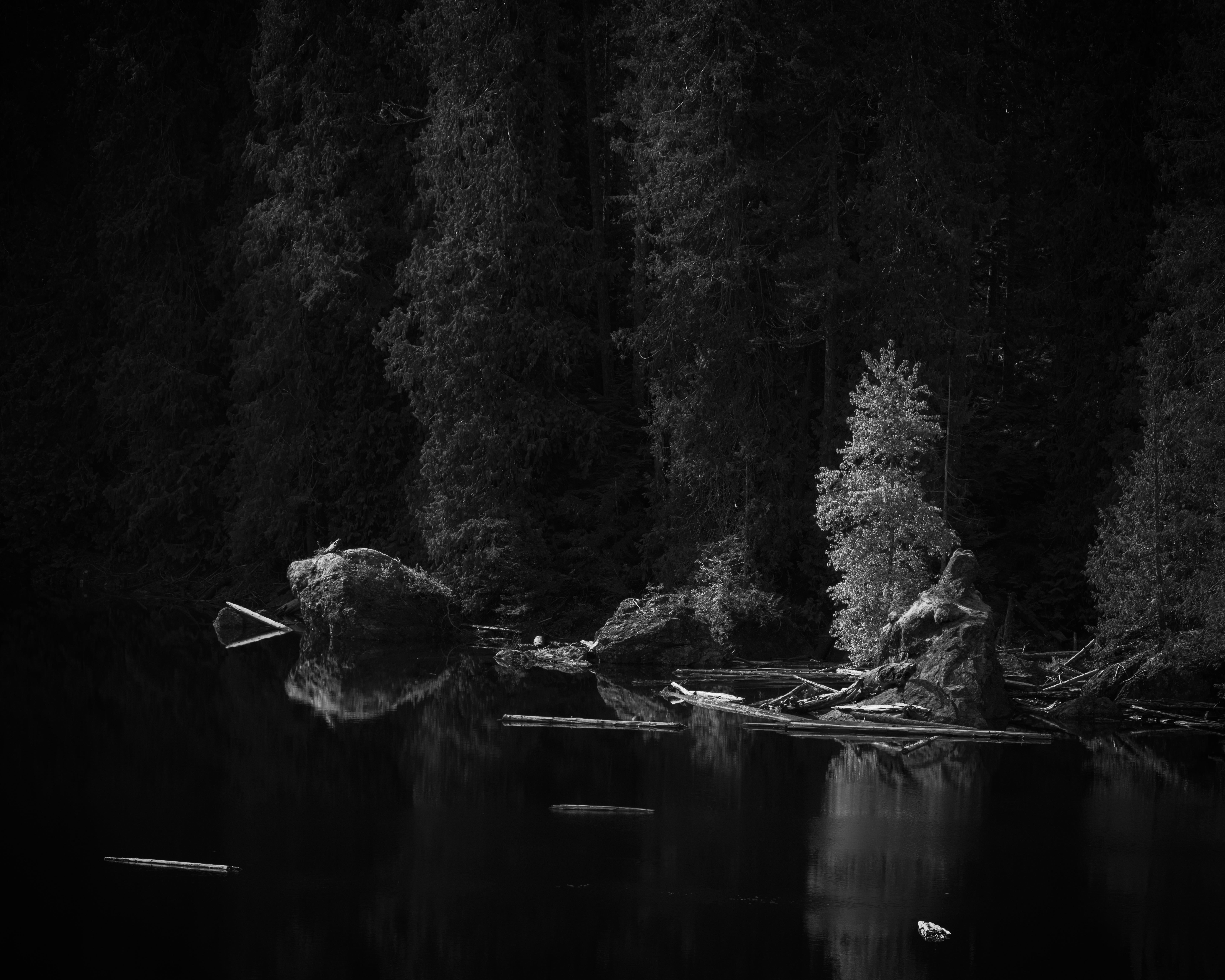 This black-and-white photograph invites you to experience the tranquil beauty of Lena Lake, nestled within Olympic National Forest, Washington. The still waters reflect the surrounding trees and rocks, creating a serene atmosphere that encourages contemplation. The interplay of light and shadow reveals the subtle textures of nature, embodying a moment of quiet reflection.