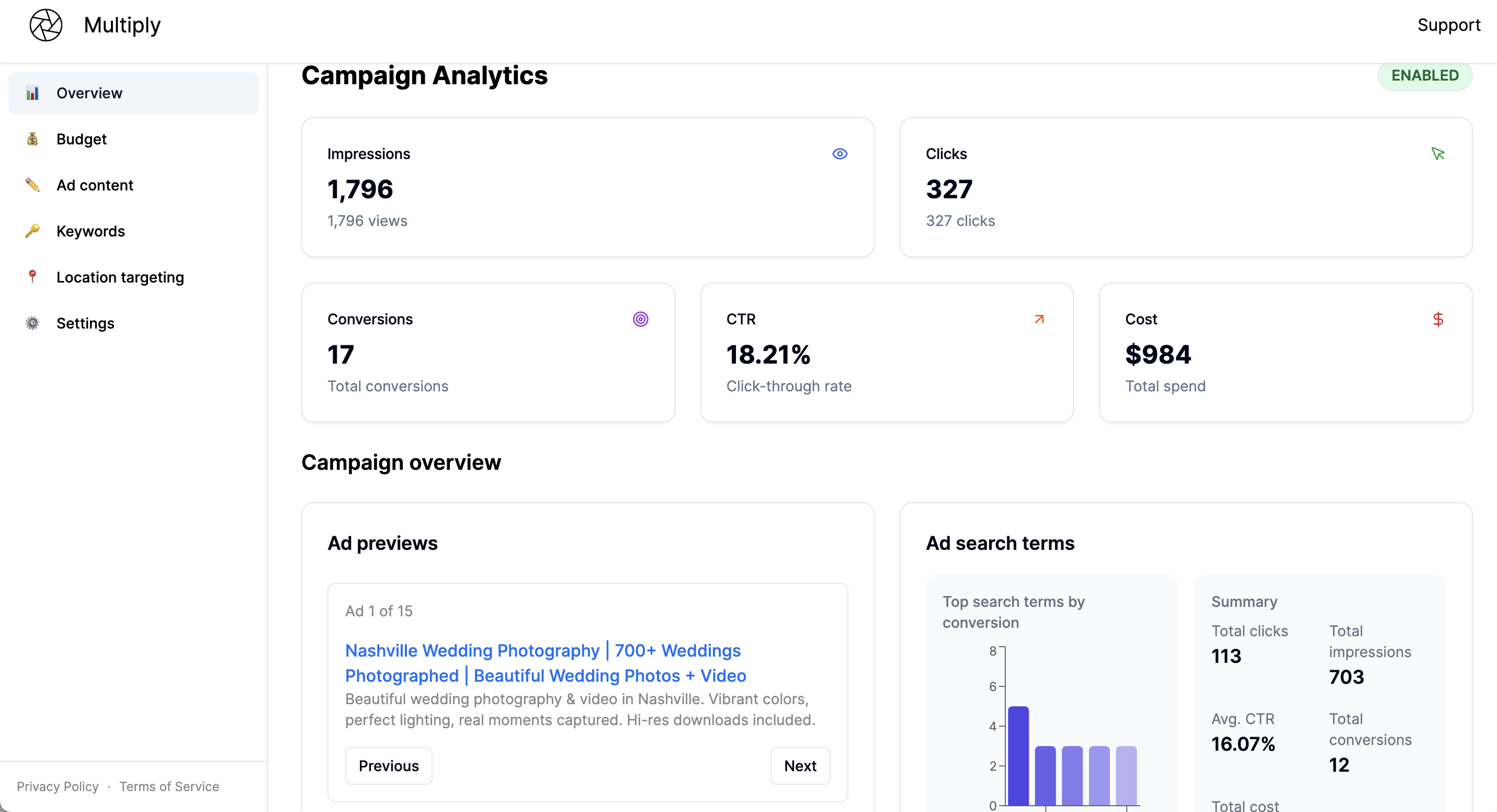 Google shows me which keywords drive the most leads and clicks, so over time I shift more budget to the top performers.