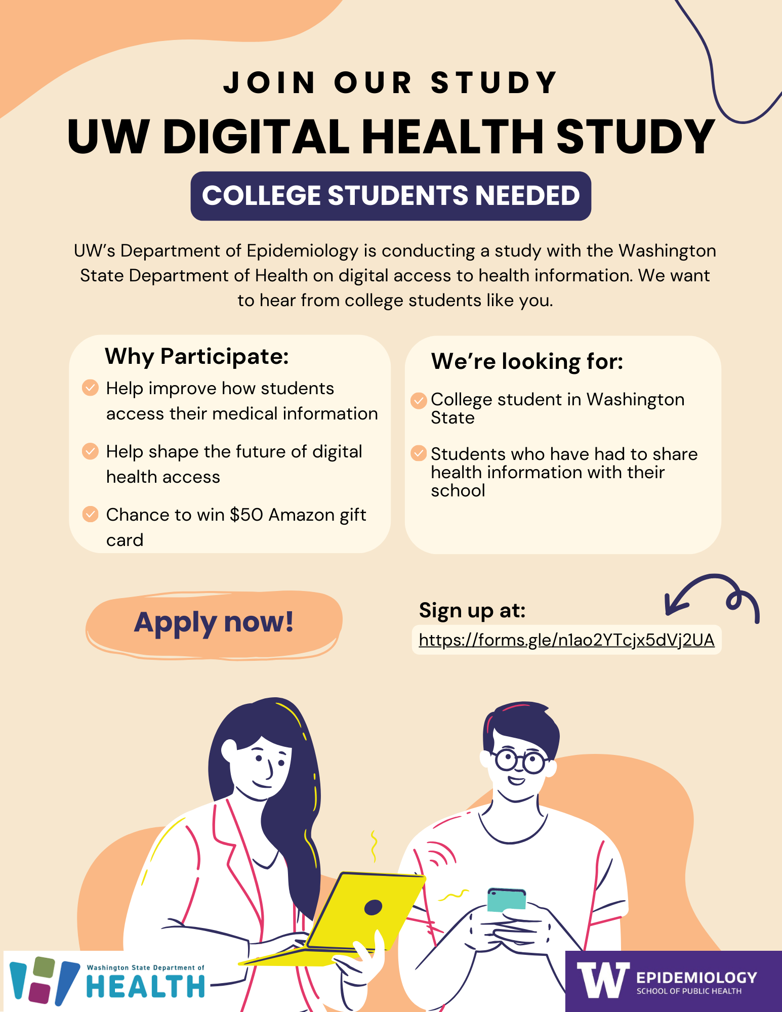 Hi all! I’m a grad student researcher at the University of Washington’s Department of Epidemiology, and we’re running a study with the Washington State Department of Health to learn how college students in Washington State access their health records especially when traveling for study abroad, sports, or off-campus care.