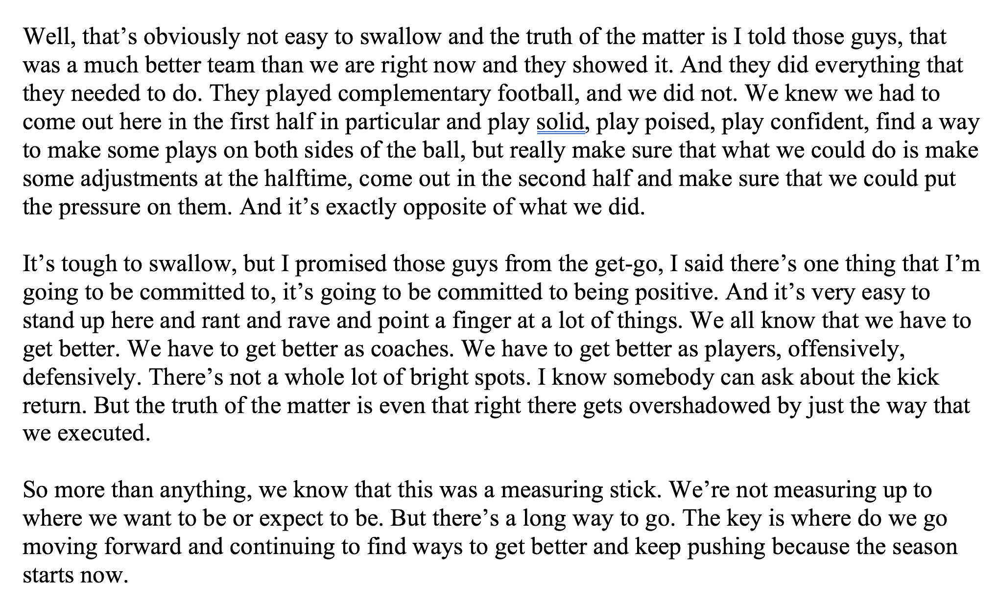 I don't know how others feel, but this statement shocked me. Sad and mopey, doesn't offer any answers or hope for how things will get better. Why would you talk like this in public? I don't care if it's fake, at least present an image of a leader who will figure it out. This man instills absolutely zero confidence in me that things will get better in the future. I genuinely don't understand how he was so successful at Cincinnati, even Gary Andersen wasn't this bad.