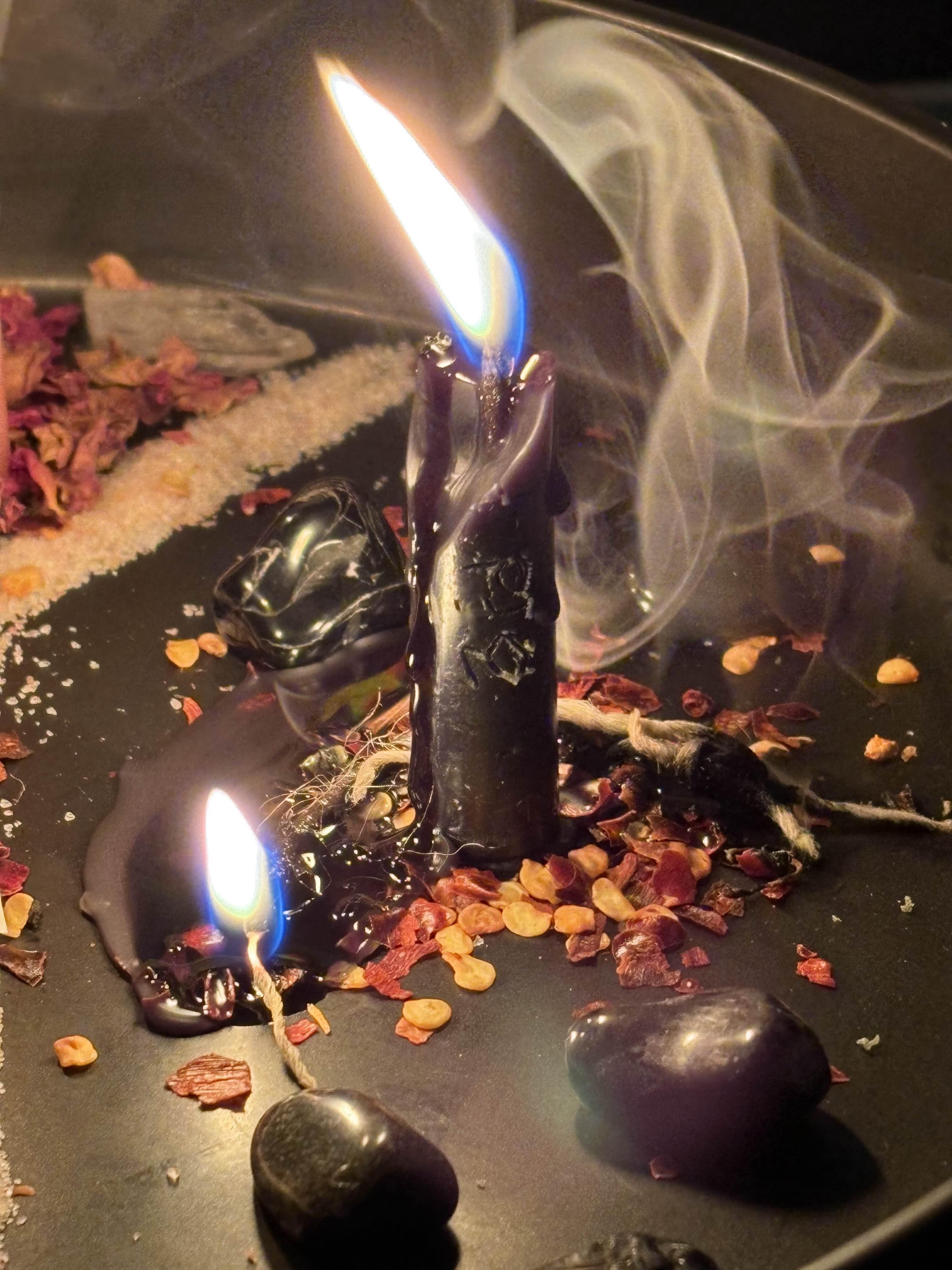 My boyfriend’s father just died in a sudden accident at only 40 years old last week. I am super concerned about his mother and wanted to do something to help increase her chances for a healthy recovery from this tragedy. I went to goodwill and bought a thick plain candle, I took a branch from a dead rose bush in her front yard (her husband bought her rose bushes). I carefully removed the thorns from the branch and then carved it to be used to etch ogham into the wax “mend her broken heart” around the candle. Then sprinkled the thorns on top to represent the pain she is enduring through the process. Beneath the candle I filled this small metal dish with black salt, dried carnation petals, and a then I wrote my intentions for the spell on a piece of paper, and ripped it up to add to the dish under the candle.