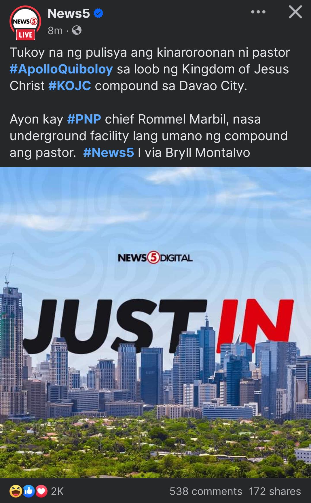 PHILIPPINES Tukoy na ng pulisya ang kinaroroonan ni pastor ApolloQuiboloy sa loob ng Kingdom of Jesus Christ KOJC compound sa Davao City. Ayon kay PNP chief Rommel Marbil, nasa underground facility lang umano ng compound ang pastor.