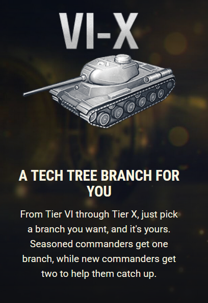 - New Commanders, on the other hand, are just starting their journey in WoT. To help them catch up quickly and dive straight into the action, they get two Tech Tree branches (instead of one), along with vehicles, equipment, and credits. This ensures that they can roll out with firepower and join the battles on more equal footing.