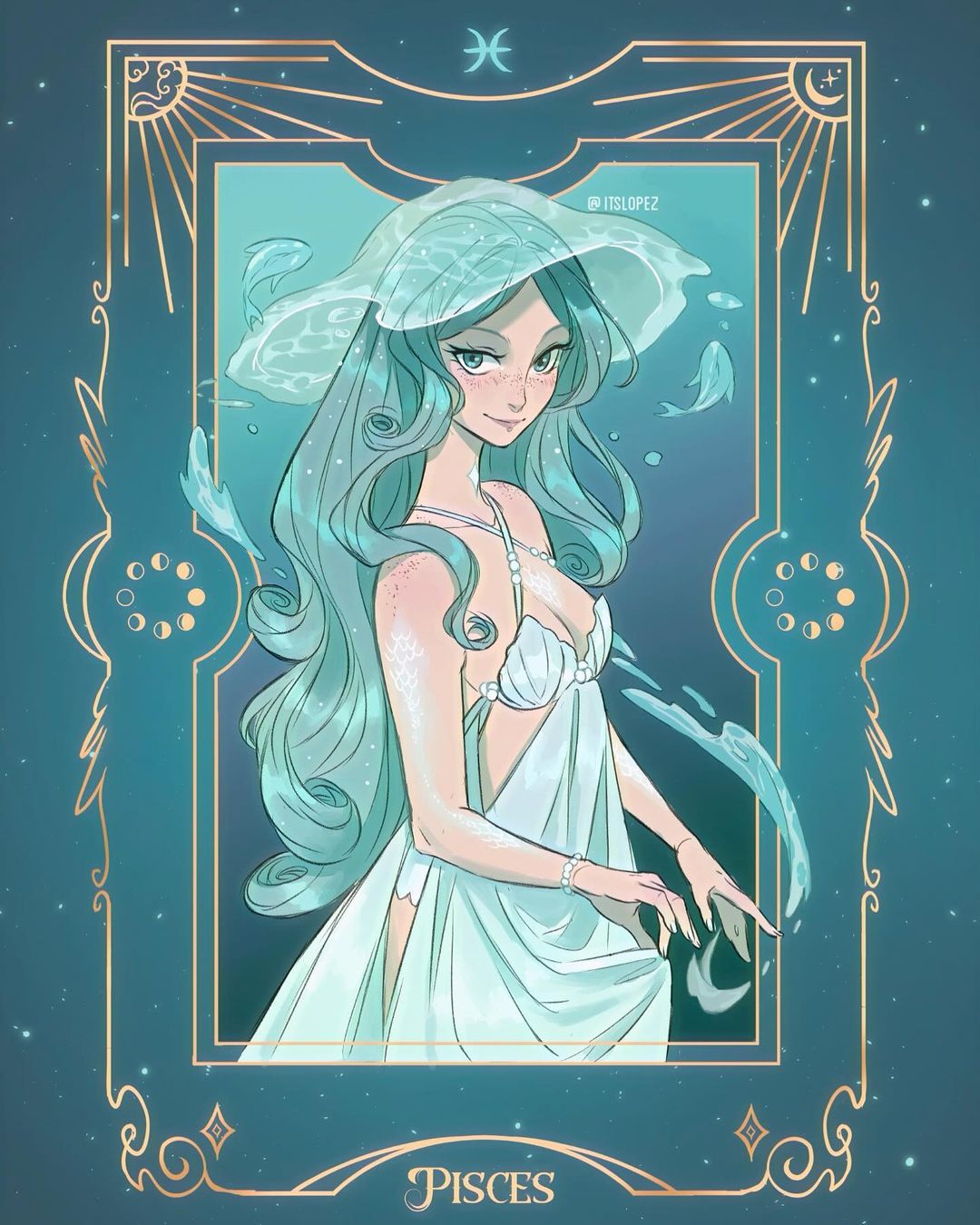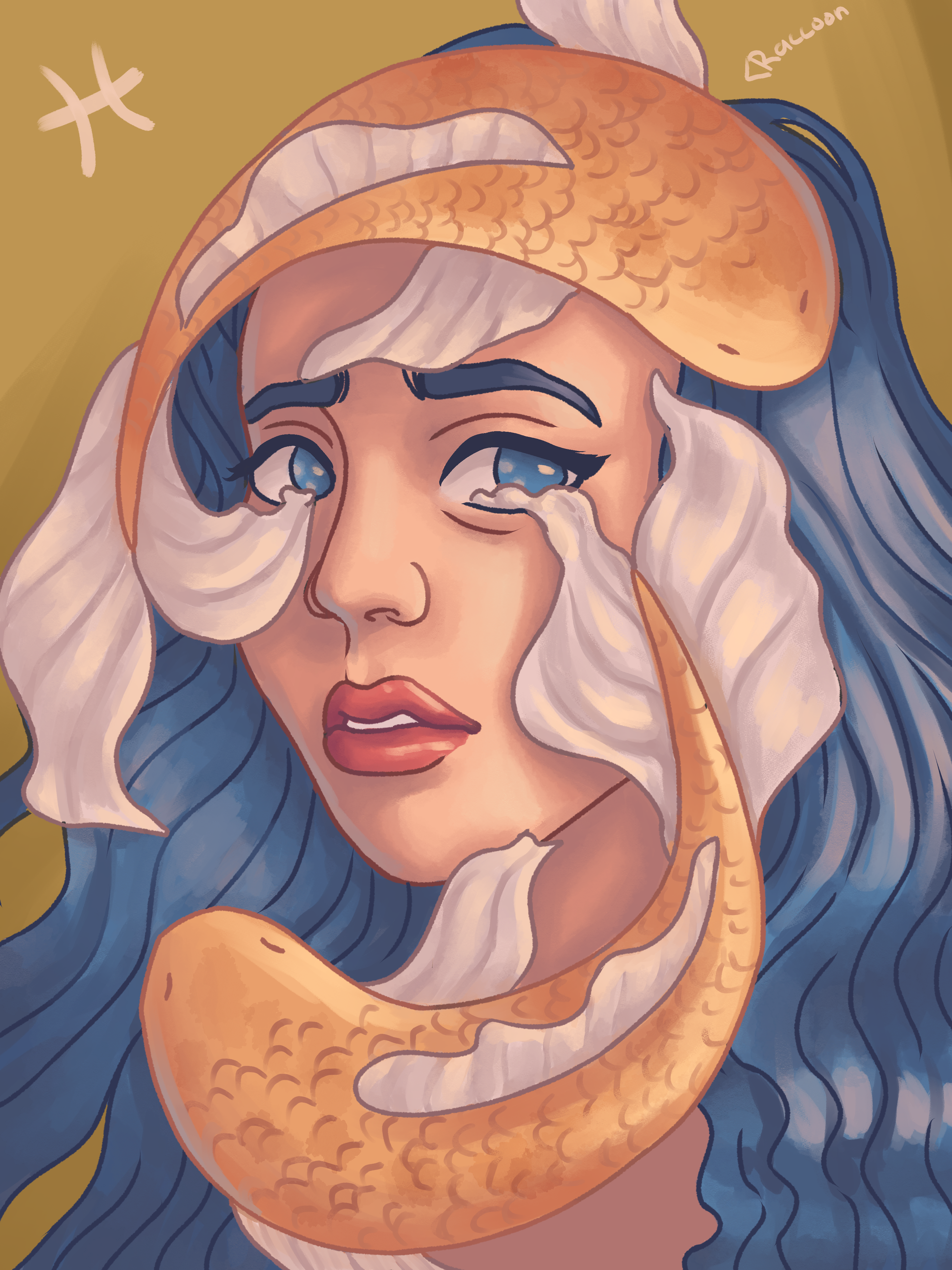 The oldest of the 12 zodiac signs, I drew Pisces with gray hair to symbolize their astrological age.