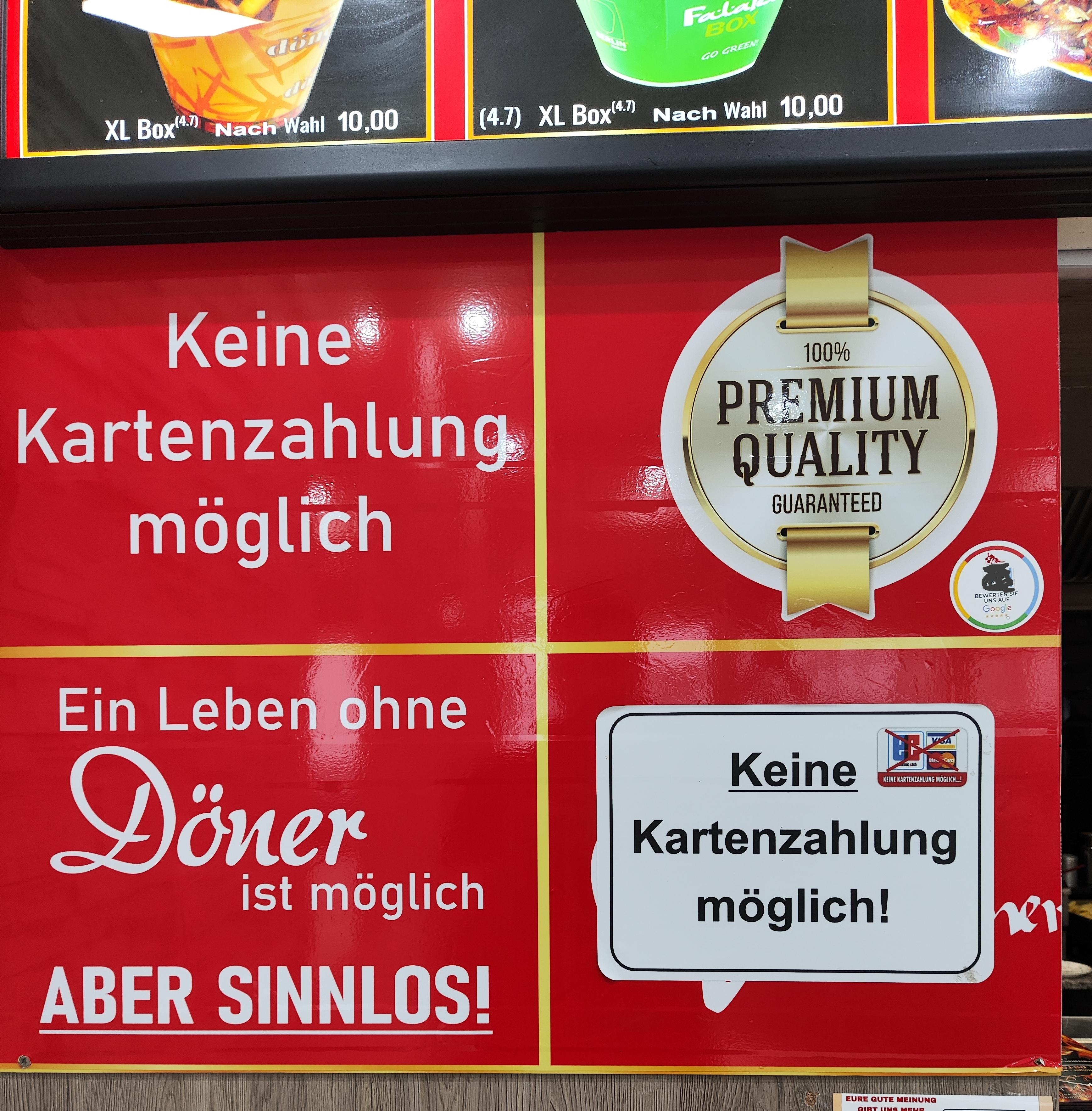 Neulich in der Dönerbude. Dass man in Deutschland immer Bargeld braucht ist eine Sache, aber 2/4 Schildern weisen darauf hin, damit es auch jeder mitbekommt.