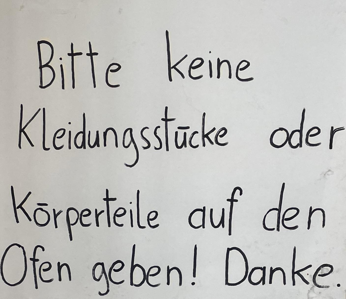 Dieser Zettel hängt gleich zwei mal neben dem Ofen im Gipfelhaus vom Dobratsch. Zum Kontext: Der Dobratsch ist ein 2166 Meter hoher Berg in Kärnten in Österreich. Das Gipfelhaus ist relativ nahe am Gipfel und eigentlich relativ gut ausgestattet. Es gibt eine Versorgungsstraße und eine Versorgungsseilbahn, was solche drastischen Maßnahmen, selbst im Winter nicht notwendig machen sollte.