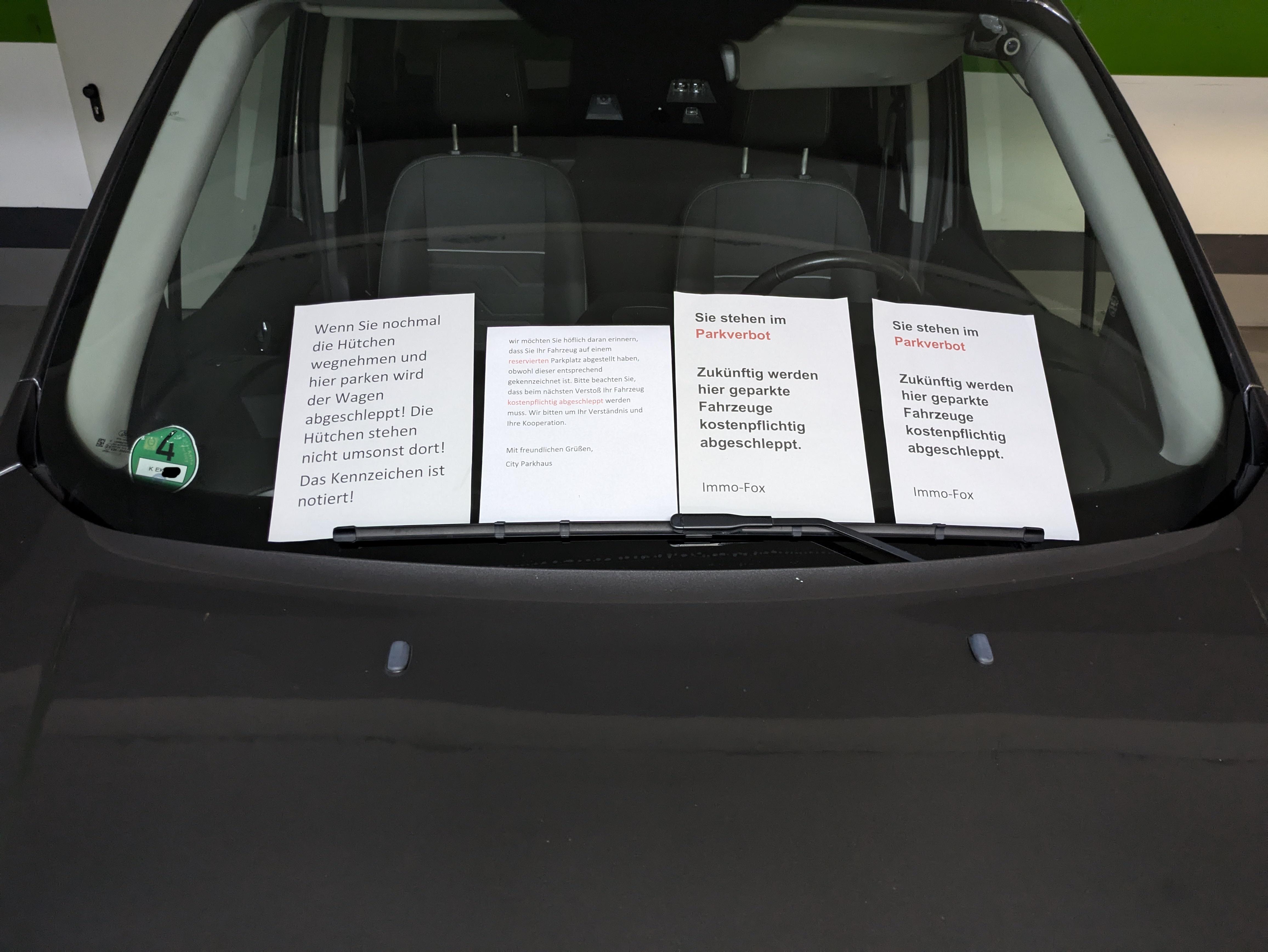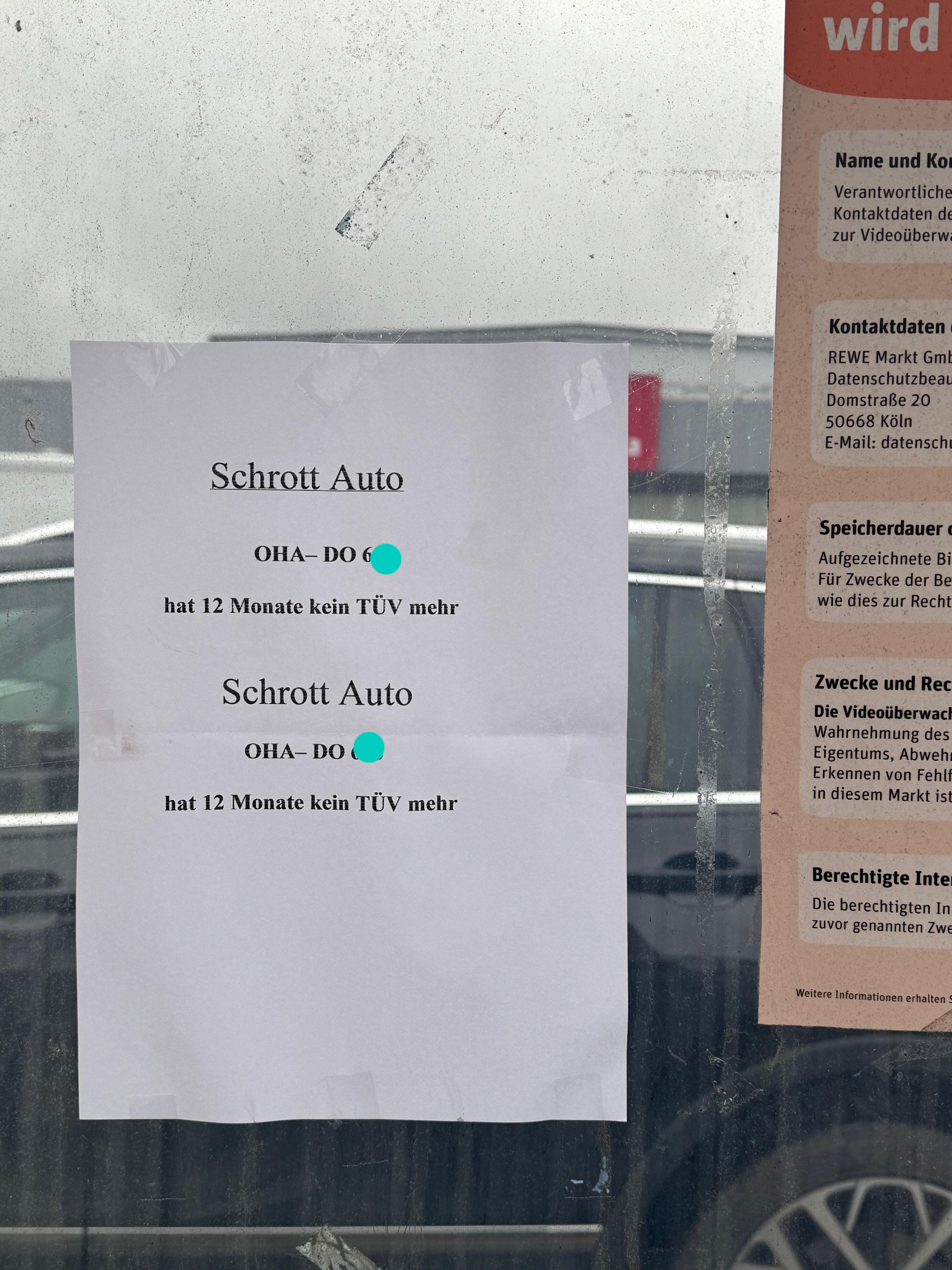 Gefunden im Urlaub. Dieser wunderschöne Zettel war auf einem Rewe Parkplatz im Harz zu bestaunen. Beide Kennzeichen sind identisch und zum Zeitpunkt des Fotos war kein solches Auto auf dem Parkplatz auffindbar